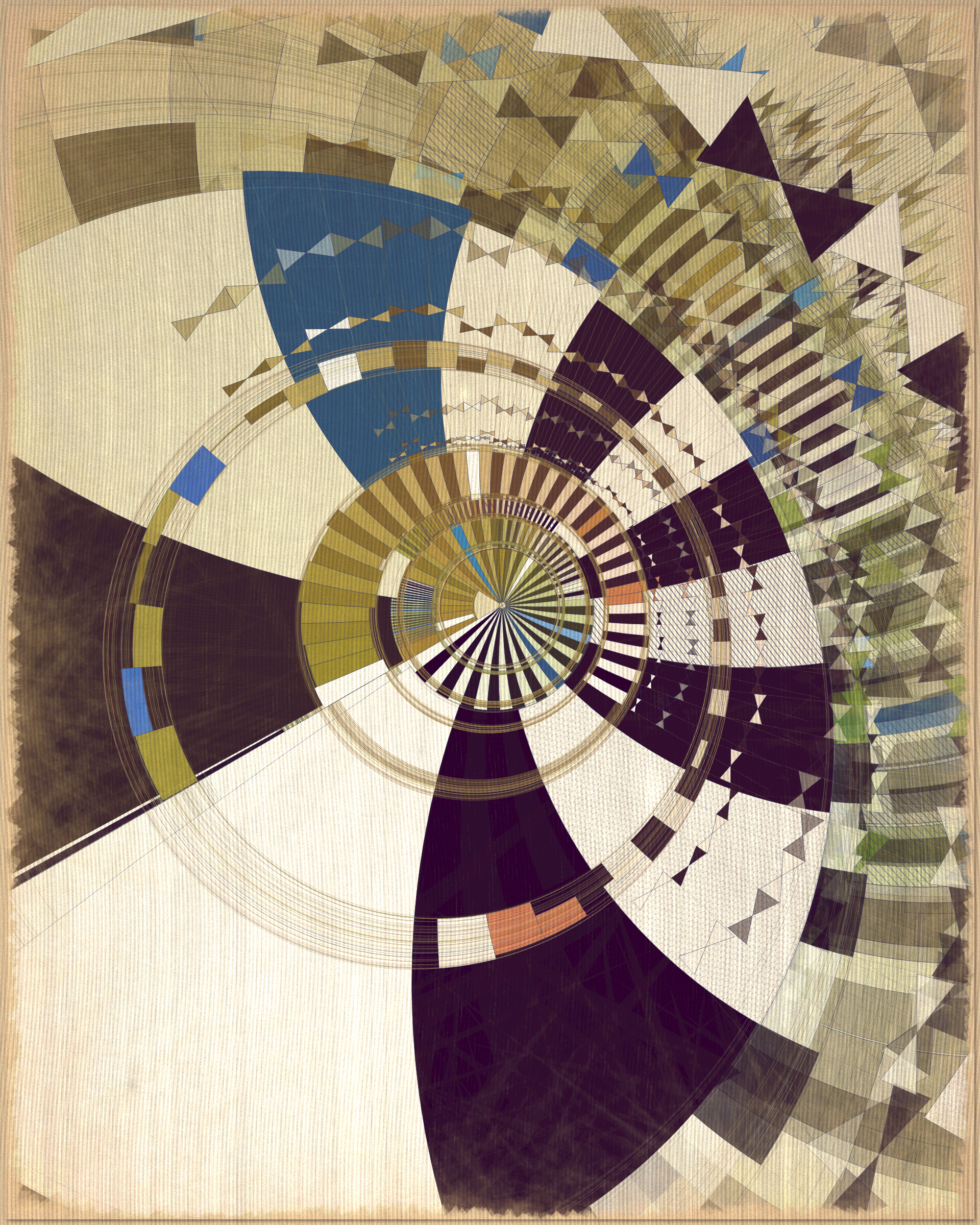 This project is a playful attempt at abstractly capturing the flowing movement of a fountain using precisely drawn elements that evoke a static and considered rendering of a subject that is in constant flux. The visual language is reminiscent of hand-draughted technical drawing, a precise and methodical practice that progresses at a radically different pace to the flowing and capricious movement of water. To increase this tension between dynamic motion and static mechanical process I wanted the surface textures to appear worn and aged like a drawing that has spent its life in the bottom of a mechanics drawer. This process of abrasion and discoloration is occurring on yet another scale of time adding complexity to the references of time passing.
