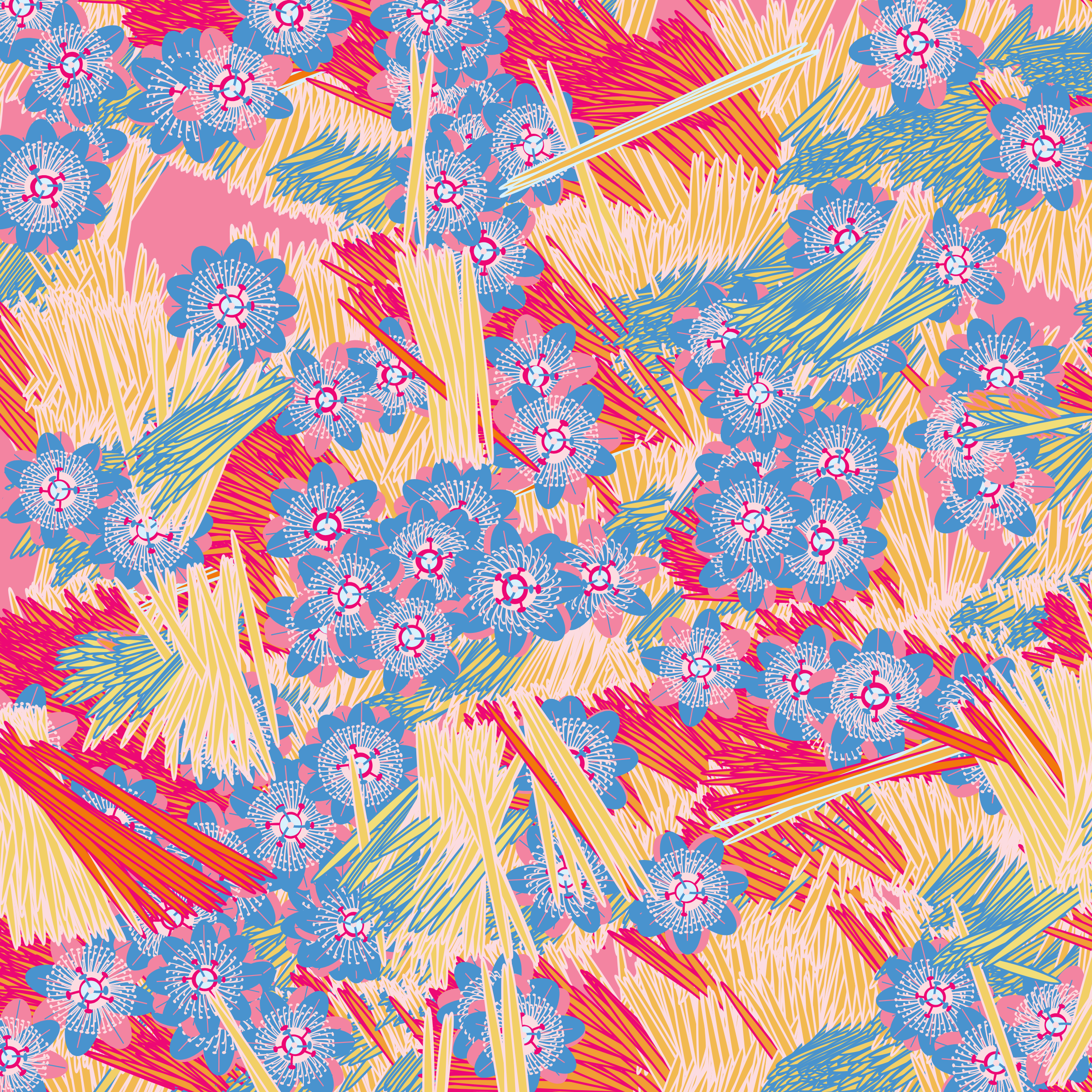 “Fragments of an infinite field” is a compositional system in which an idealized plant species is generated and arranged in a potentially infinite field of foliage. The main environmental parameter of the composition is the determination of a season of the year. The season determines the landscape’s colors and defines specific phenomena for each of them, such as rain in summer, snow in winter, petals falling in autumn, and pollen in spring. The flower has several possible variables, which can be macro aspects, affecting the entire population of the species, or micro, affecting each individual of the species differently. For example, the number of petals can be equal in all individuals or not. The number of filaments and other structures of the flower can undergo minor deviations, generating small mutations. The confusion between the figure (plant) and the background (earth, sky, other natural elements) is fascinating from a compositional point of view. The background colors are, most of the time, colors present in the figures, often breaking the boundary between them and, therefore, generating chromatic masses. In this project I also intend to research the following question: How to create parameters that resemble a living organism's growth? In this sense, the project approaches digital morphogenesis and the development of procedural organisms.