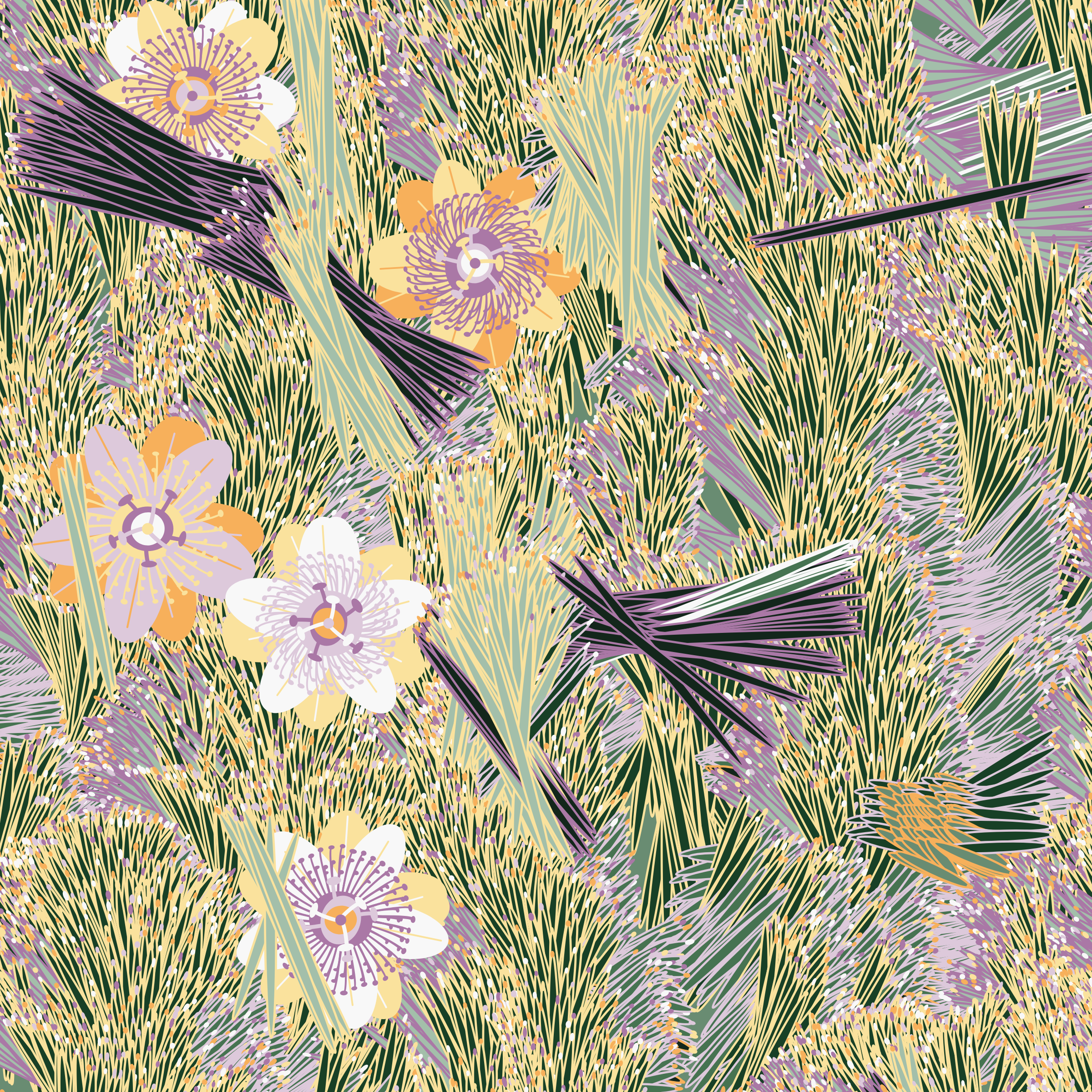 “Fragments of an infinite field” is a compositional system in which an idealized plant species is generated and arranged in a potentially infinite field of foliage. The main environmental parameter of the composition is the determination of a season of the year. The season determines the landscape’s colors and defines specific phenomena for each of them, such as rain in summer, snow in winter, petals falling in autumn, and pollen in spring. The flower has several possible variables, which can be macro aspects, affecting the entire population of the species, or micro, affecting each individual of the species differently. For example, the number of petals can be equal in all individuals or not. The number of filaments and other structures of the flower can undergo minor deviations, generating small mutations. The confusion between the figure (plant) and the background (earth, sky, other natural elements) is fascinating from a compositional point of view. The background colors are, most of the time, colors present in the figures, often breaking the boundary between them and, therefore, generating chromatic masses. In this project I also intend to research the following question: How to create parameters that resemble a living organism's growth? In this sense, the project approaches digital morphogenesis and the development of procedural organisms.