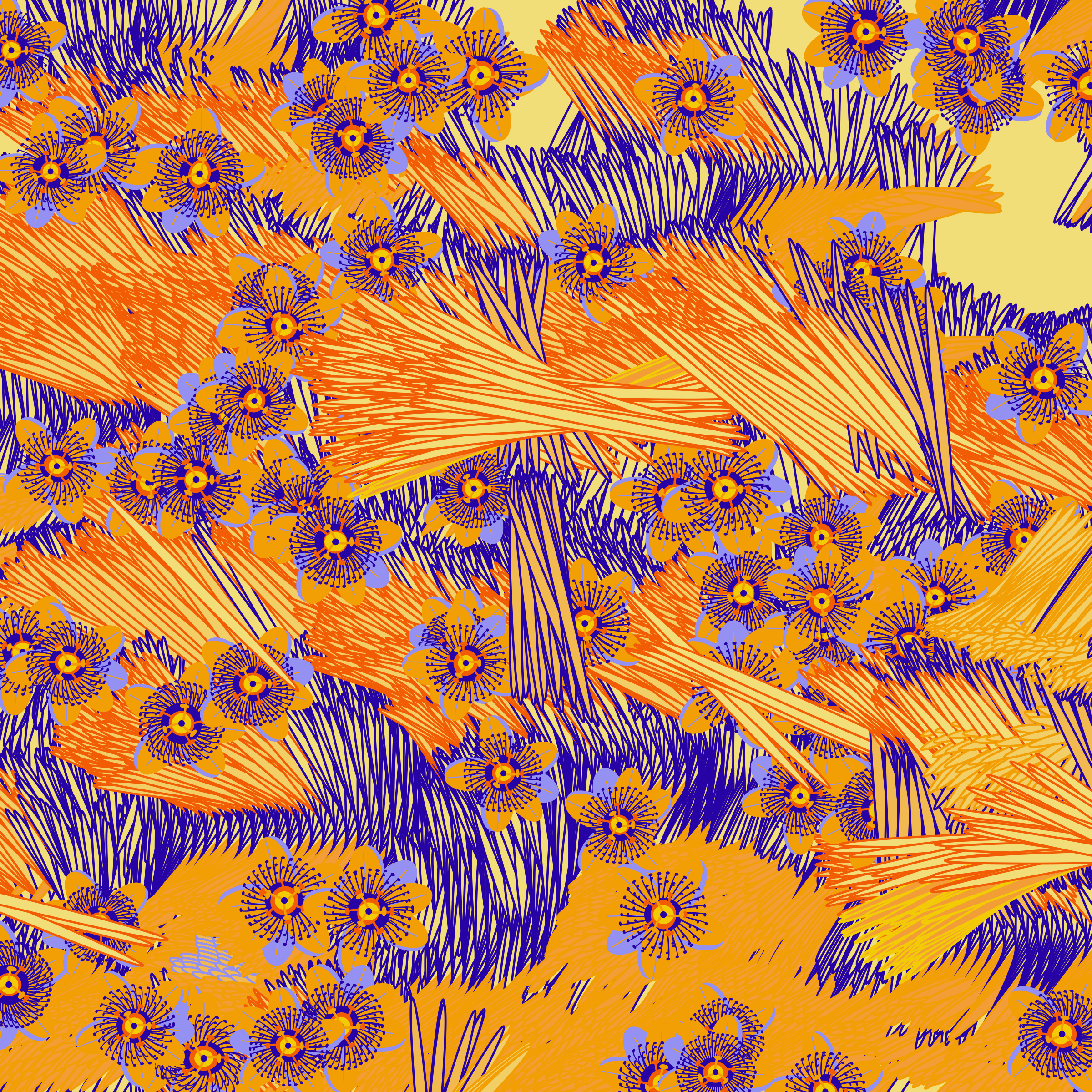 “Fragments of an infinite field” is a compositional system in which an idealized plant species is generated and arranged in a potentially infinite field of foliage. The main environmental parameter of the composition is the determination of a season of the year. The season determines the landscape’s colors and defines specific phenomena for each of them, such as rain in summer, snow in winter, petals falling in autumn, and pollen in spring. The flower has several possible variables, which can be macro aspects, affecting the entire population of the species, or micro, affecting each individual of the species differently. For example, the number of petals can be equal in all individuals or not. The number of filaments and other structures of the flower can undergo minor deviations, generating small mutations. The confusion between the figure (plant) and the background (earth, sky, other natural elements) is fascinating from a compositional point of view. The background colors are, most of the time, colors present in the figures, often breaking the boundary between them and, therefore, generating chromatic masses. In this project I also intend to research the following question: How to create parameters that resemble a living organism's growth? In this sense, the project approaches digital morphogenesis and the development of procedural organisms.