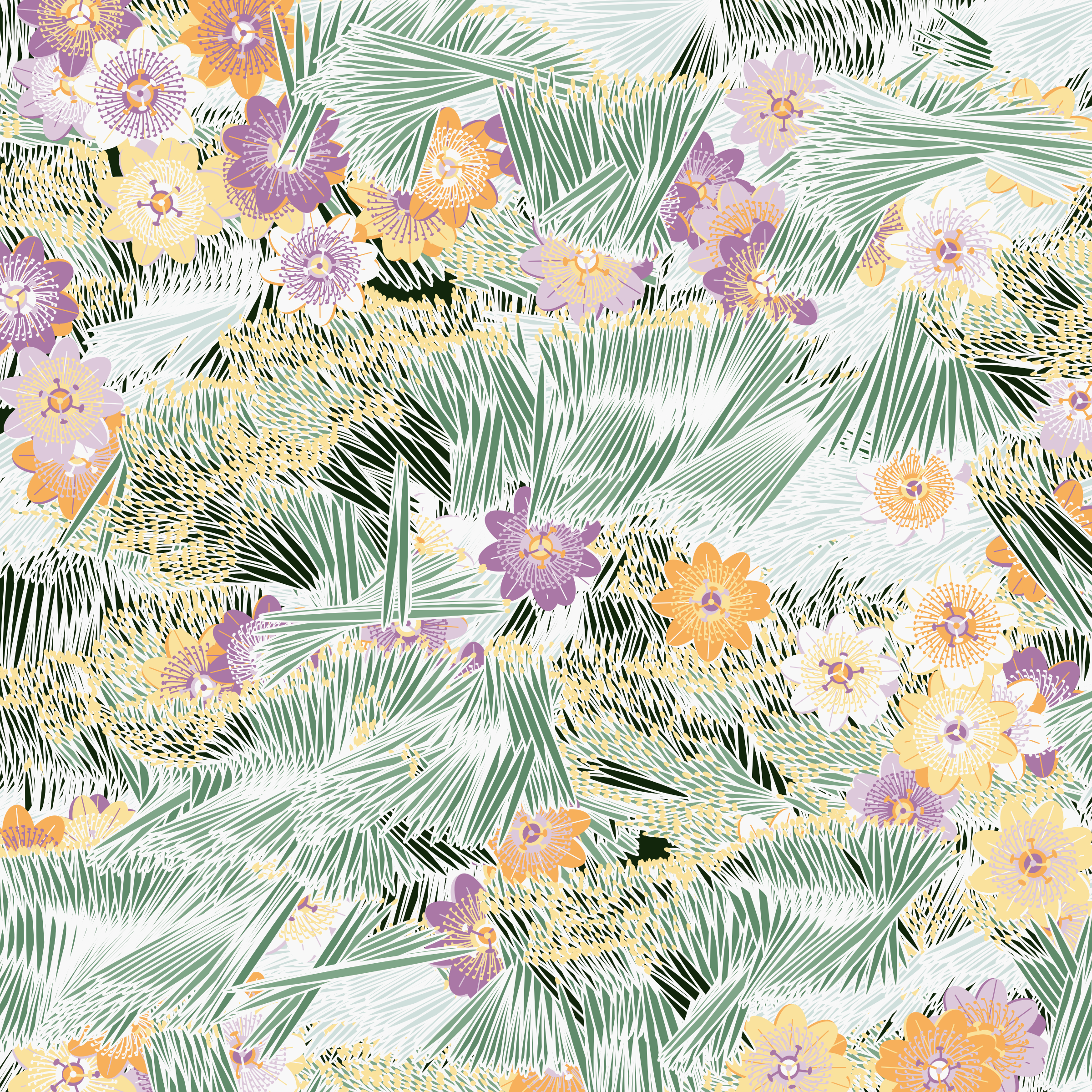 “Fragments of an infinite field” is a compositional system in which an idealized plant species is generated and arranged in a potentially infinite field of foliage. The main environmental parameter of the composition is the determination of a season of the year. The season determines the landscape’s colors and defines specific phenomena for each of them, such as rain in summer, snow in winter, petals falling in autumn, and pollen in spring. The flower has several possible variables, which can be macro aspects, affecting the entire population of the species, or micro, affecting each individual of the species differently. For example, the number of petals can be equal in all individuals or not. The number of filaments and other structures of the flower can undergo minor deviations, generating small mutations. The confusion between the figure (plant) and the background (earth, sky, other natural elements) is fascinating from a compositional point of view. The background colors are, most of the time, colors present in the figures, often breaking the boundary between them and, therefore, generating chromatic masses. In this project I also intend to research the following question: How to create parameters that resemble a living organism's growth? In this sense, the project approaches digital morphogenesis and the development of procedural organisms.