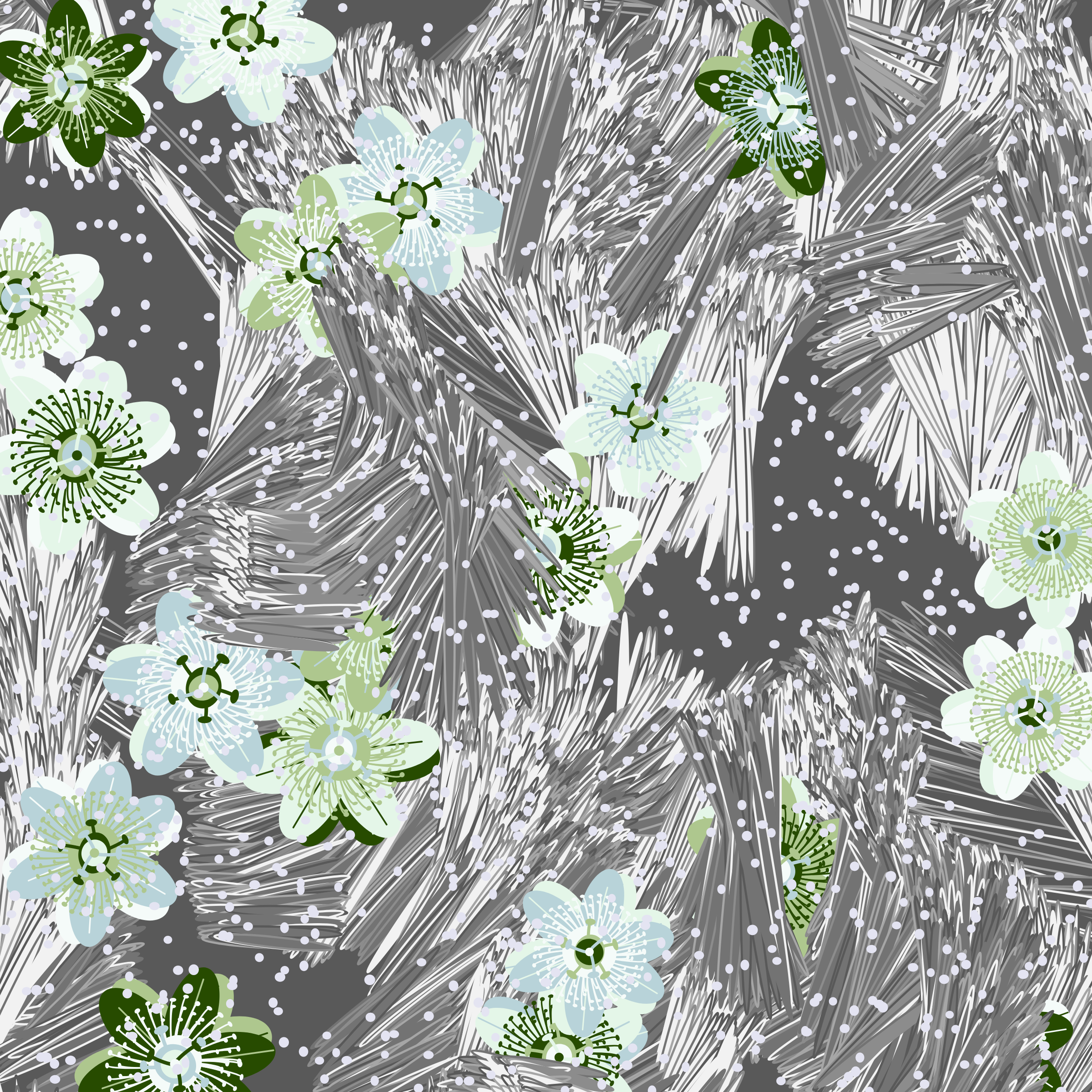 “Fragments of an infinite field” is a compositional system in which an idealized plant species is generated and arranged in a potentially infinite field of foliage. The main environmental parameter of the composition is the determination of a season of the year. The season determines the landscape’s colors and defines specific phenomena for each of them, such as rain in summer, snow in winter, petals falling in autumn, and pollen in spring. The flower has several possible variables, which can be macro aspects, affecting the entire population of the species, or micro, affecting each individual of the species differently. For example, the number of petals can be equal in all individuals or not. The number of filaments and other structures of the flower can undergo minor deviations, generating small mutations. The confusion between the figure (plant) and the background (earth, sky, other natural elements) is fascinating from a compositional point of view. The background colors are, most of the time, colors present in the figures, often breaking the boundary between them and, therefore, generating chromatic masses. In this project I also intend to research the following question: How to create parameters that resemble a living organism's growth? In this sense, the project approaches digital morphogenesis and the development of procedural organisms.
