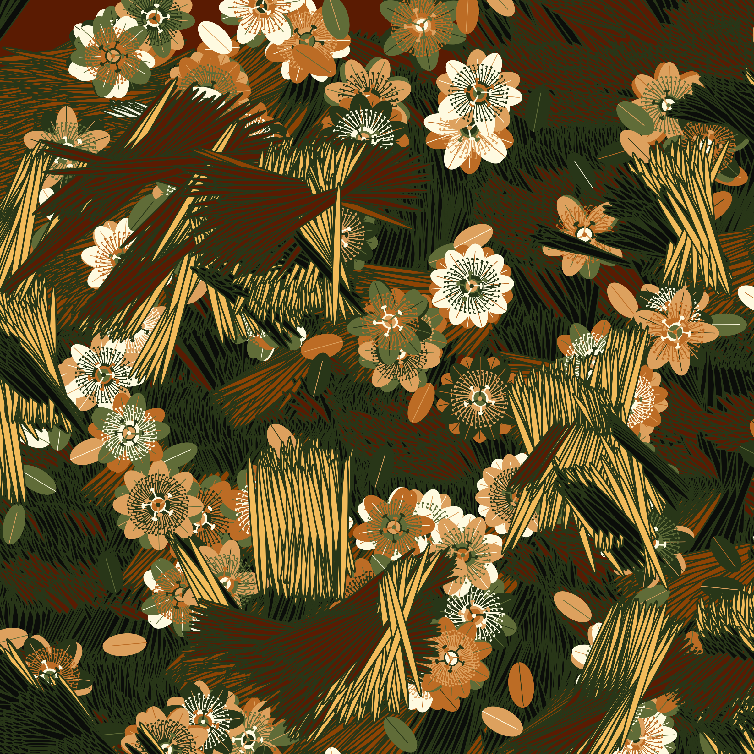 “Fragments of an infinite field” is a compositional system in which an idealized plant species is generated and arranged in a potentially infinite field of foliage. The main environmental parameter of the composition is the determination of a season of the year. The season determines the landscape’s colors and defines specific phenomena for each of them, such as rain in summer, snow in winter, petals falling in autumn, and pollen in spring. The flower has several possible variables, which can be macro aspects, affecting the entire population of the species, or micro, affecting each individual of the species differently. For example, the number of petals can be equal in all individuals or not. The number of filaments and other structures of the flower can undergo minor deviations, generating small mutations. The confusion between the figure (plant) and the background (earth, sky, other natural elements) is fascinating from a compositional point of view. The background colors are, most of the time, colors present in the figures, often breaking the boundary between them and, therefore, generating chromatic masses. In this project I also intend to research the following question: How to create parameters that resemble a living organism's growth? In this sense, the project approaches digital morphogenesis and the development of procedural organisms.