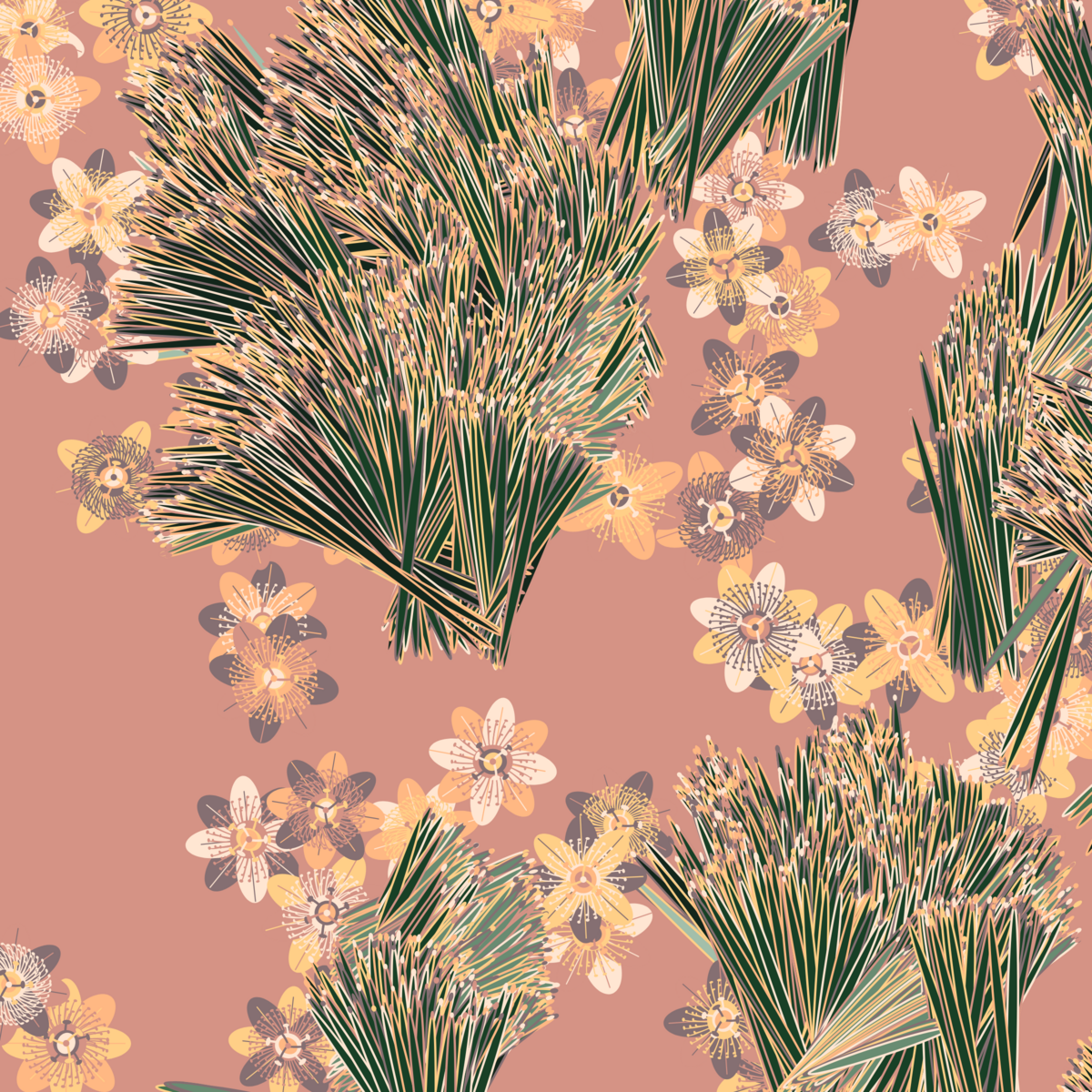 “Fragments of an infinite field” is a compositional system in which an idealized plant species is generated and arranged in a potentially infinite field of foliage. The main environmental parameter of the composition is the determination of a season of the year. The season determines the landscape’s colors and defines specific phenomena for each of them, such as rain in summer, snow in winter, petals falling in autumn, and pollen in spring. The flower has several possible variables, which can be macro aspects, affecting the entire population of the species, or micro, affecting each individual of the species differently. For example, the number of petals can be equal in all individuals or not. The number of filaments and other structures of the flower can undergo minor deviations, generating small mutations. The confusion between the figure (plant) and the background (earth, sky, other natural elements) is fascinating from a compositional point of view. The background colors are, most of the time, colors present in the figures, often breaking the boundary between them and, therefore, generating chromatic masses. In this project I also intend to research the following question: How to create parameters that resemble a living organism's growth? In this sense, the project approaches digital morphogenesis and the development of procedural organisms.