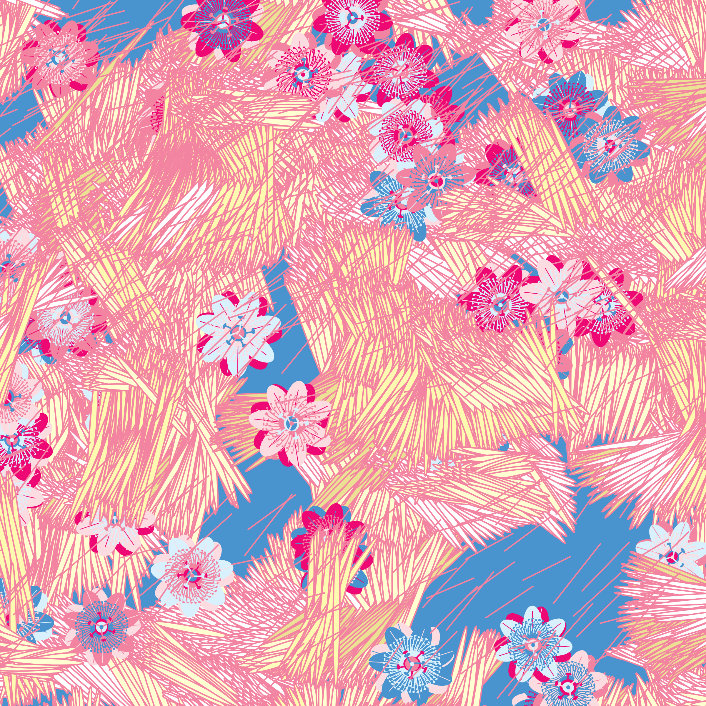 “Fragments of an infinite field” is a compositional system in which an idealized plant species is generated and arranged in a potentially infinite field of foliage. The main environmental parameter of the composition is the determination of a season of the year. The season determines the landscape’s colors and defines specific phenomena for each of them, such as rain in summer, snow in winter, petals falling in autumn, and pollen in spring. The flower has several possible variables, which can be macro aspects, affecting the entire population of the species, or micro, affecting each individual of the species differently. For example, the number of petals can be equal in all individuals or not. The number of filaments and other structures of the flower can undergo minor deviations, generating small mutations. The confusion between the figure (plant) and the background (earth, sky, other natural elements) is fascinating from a compositional point of view. The background colors are, most of the time, colors present in the figures, often breaking the boundary between them and, therefore, generating chromatic masses. In this project I also intend to research the following question: How to create parameters that resemble a living organism's growth? In this sense, the project approaches digital morphogenesis and the development of procedural organisms.