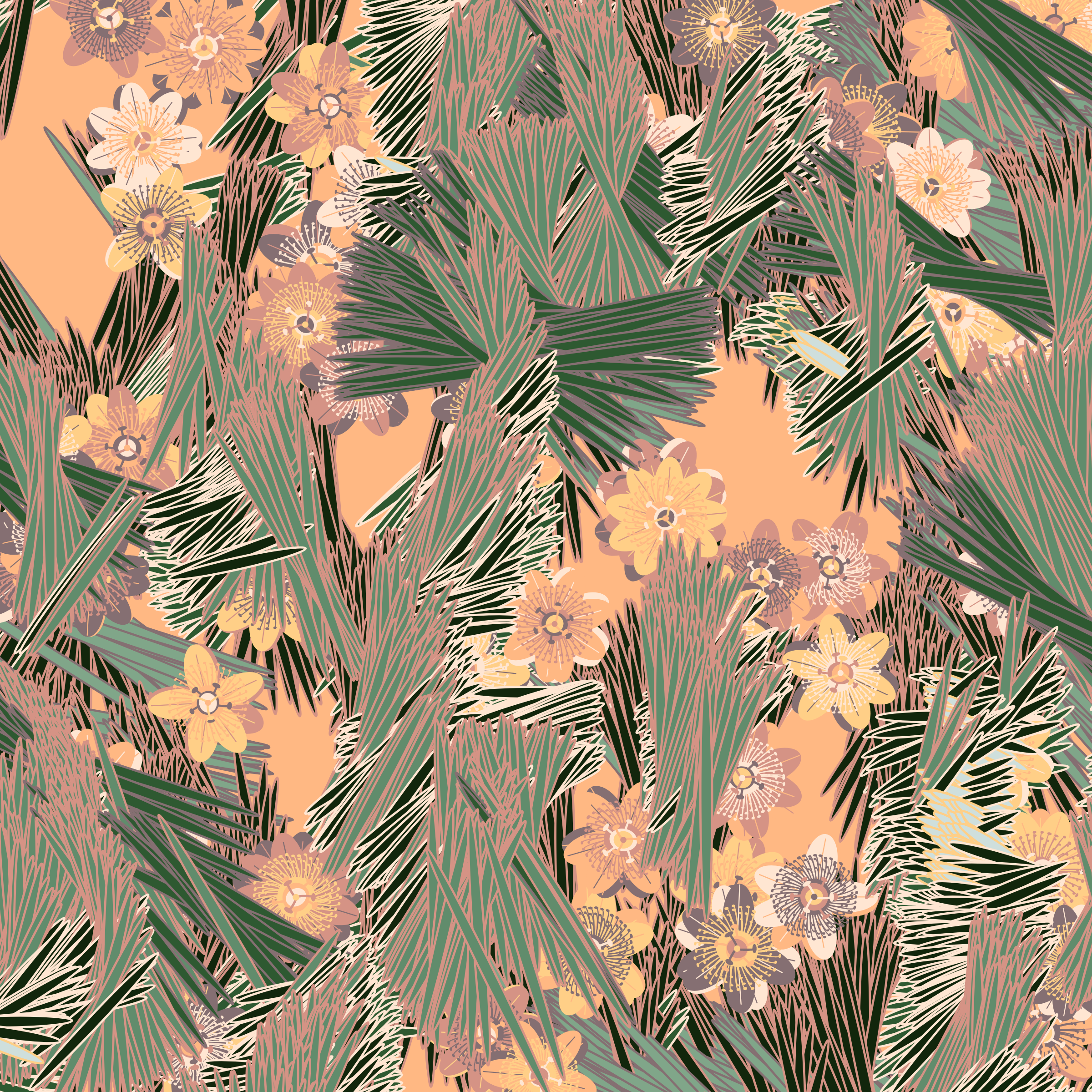 “Fragments of an infinite field” is a compositional system in which an idealized plant species is generated and arranged in a potentially infinite field of foliage. The main environmental parameter of the composition is the determination of a season of the year. The season determines the landscape’s colors and defines specific phenomena for each of them, such as rain in summer, snow in winter, petals falling in autumn, and pollen in spring. The flower has several possible variables, which can be macro aspects, affecting the entire population of the species, or micro, affecting each individual of the species differently. For example, the number of petals can be equal in all individuals or not. The number of filaments and other structures of the flower can undergo minor deviations, generating small mutations. The confusion between the figure (plant) and the background (earth, sky, other natural elements) is fascinating from a compositional point of view. The background colors are, most of the time, colors present in the figures, often breaking the boundary between them and, therefore, generating chromatic masses. In this project I also intend to research the following question: How to create parameters that resemble a living organism's growth? In this sense, the project approaches digital morphogenesis and the development of procedural organisms.