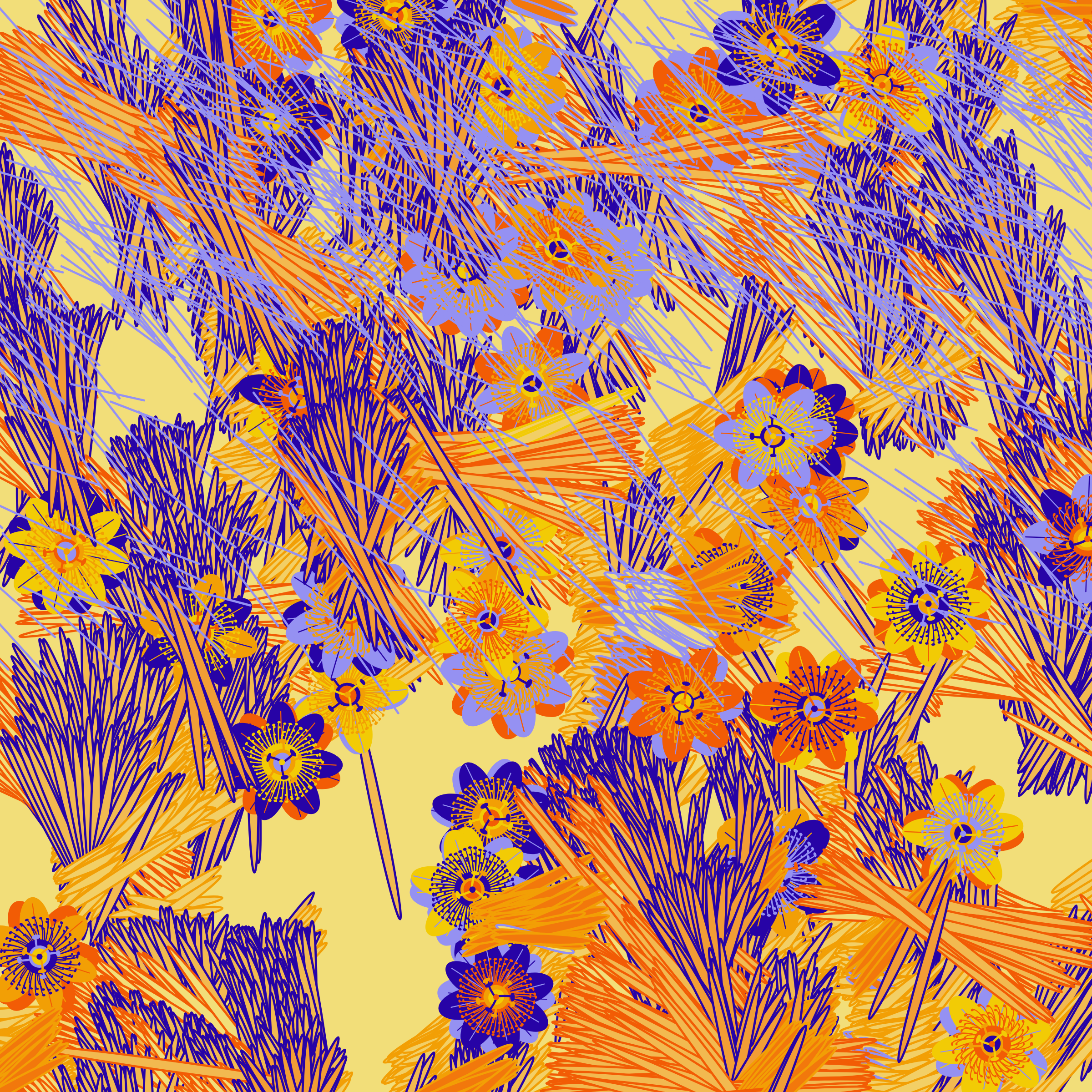 “Fragments of an infinite field” is a compositional system in which an idealized plant species is generated and arranged in a potentially infinite field of foliage. The main environmental parameter of the composition is the determination of a season of the year. The season determines the landscape’s colors and defines specific phenomena for each of them, such as rain in summer, snow in winter, petals falling in autumn, and pollen in spring. The flower has several possible variables, which can be macro aspects, affecting the entire population of the species, or micro, affecting each individual of the species differently. For example, the number of petals can be equal in all individuals or not. The number of filaments and other structures of the flower can undergo minor deviations, generating small mutations. The confusion between the figure (plant) and the background (earth, sky, other natural elements) is fascinating from a compositional point of view. The background colors are, most of the time, colors present in the figures, often breaking the boundary between them and, therefore, generating chromatic masses. In this project I also intend to research the following question: How to create parameters that resemble a living organism's growth? In this sense, the project approaches digital morphogenesis and the development of procedural organisms.