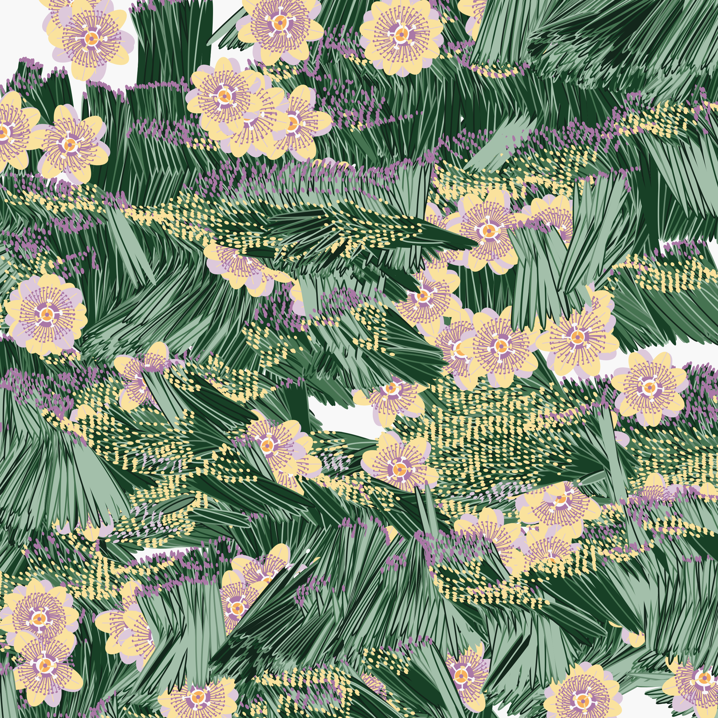“Fragments of an infinite field” is a compositional system in which an idealized plant species is generated and arranged in a potentially infinite field of foliage. The main environmental parameter of the composition is the determination of a season of the year. The season determines the landscape’s colors and defines specific phenomena for each of them, such as rain in summer, snow in winter, petals falling in autumn, and pollen in spring. The flower has several possible variables, which can be macro aspects, affecting the entire population of the species, or micro, affecting each individual of the species differently. For example, the number of petals can be equal in all individuals or not. The number of filaments and other structures of the flower can undergo minor deviations, generating small mutations. The confusion between the figure (plant) and the background (earth, sky, other natural elements) is fascinating from a compositional point of view. The background colors are, most of the time, colors present in the figures, often breaking the boundary between them and, therefore, generating chromatic masses. In this project I also intend to research the following question: How to create parameters that resemble a living organism's growth? In this sense, the project approaches digital morphogenesis and the development of procedural organisms.