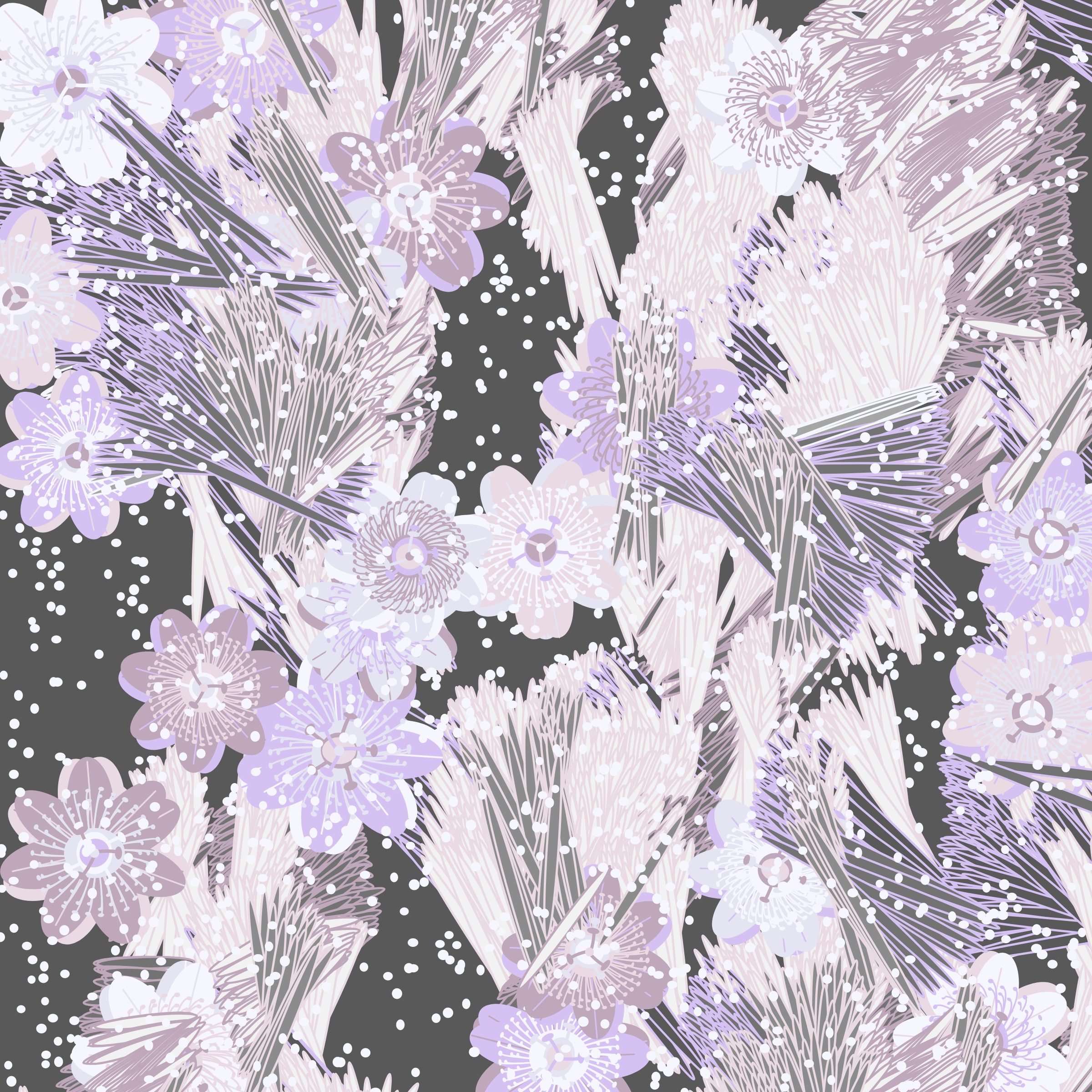 “Fragments of an infinite field” is a compositional system in which an idealized plant species is generated and arranged in a potentially infinite field of foliage. The main environmental parameter of the composition is the determination of a season of the year. The season determines the landscape’s colors and defines specific phenomena for each of them, such as rain in summer, snow in winter, petals falling in autumn, and pollen in spring. The flower has several possible variables, which can be macro aspects, affecting the entire population of the species, or micro, affecting each individual of the species differently. For example, the number of petals can be equal in all individuals or not. The number of filaments and other structures of the flower can undergo minor deviations, generating small mutations. The confusion between the figure (plant) and the background (earth, sky, other natural elements) is fascinating from a compositional point of view. The background colors are, most of the time, colors present in the figures, often breaking the boundary between them and, therefore, generating chromatic masses. In this project I also intend to research the following question: How to create parameters that resemble a living organism's growth? In this sense, the project approaches digital morphogenesis and the development of procedural organisms.