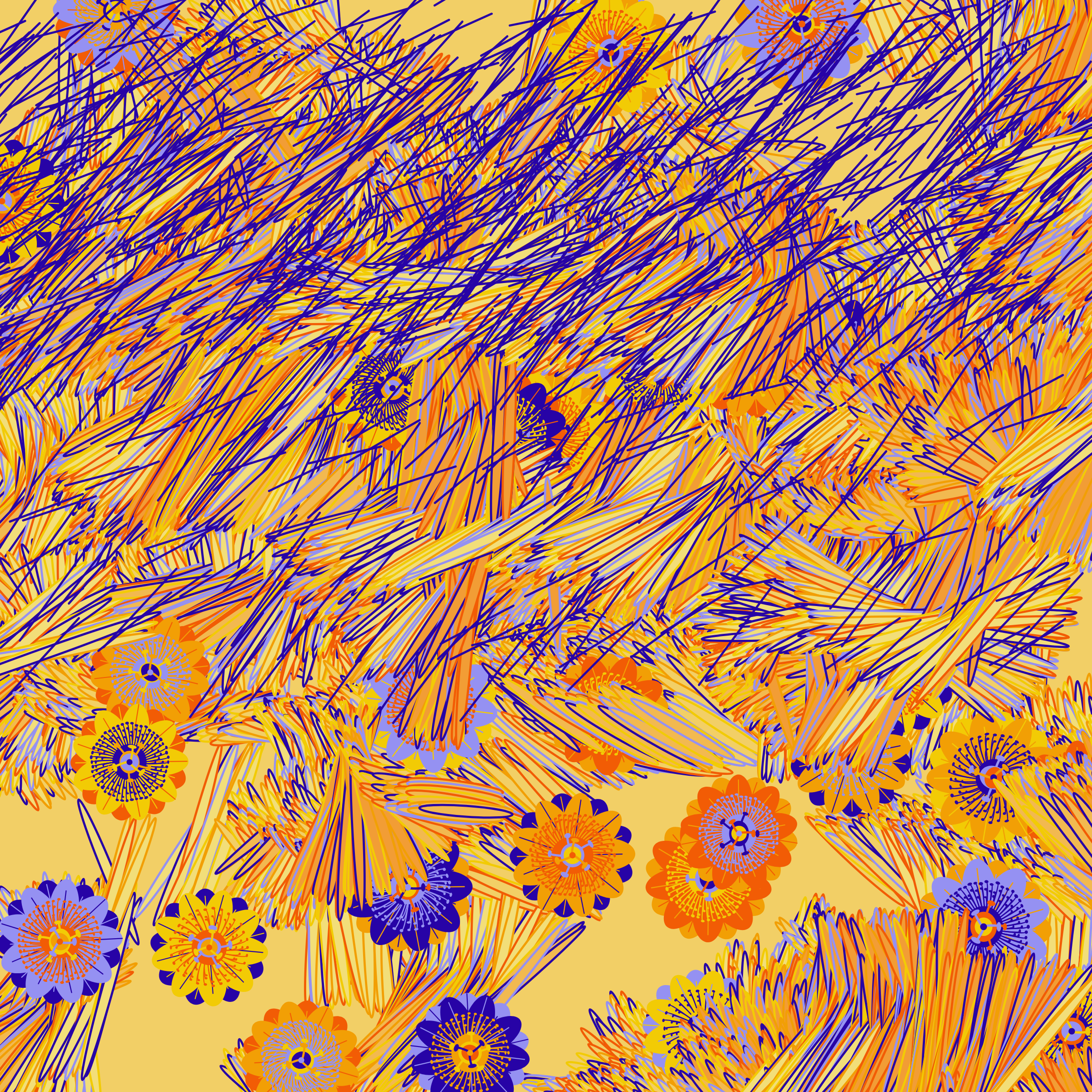“Fragments of an infinite field” is a compositional system in which an idealized plant species is generated and arranged in a potentially infinite field of foliage. The main environmental parameter of the composition is the determination of a season of the year. The season determines the landscape’s colors and defines specific phenomena for each of them, such as rain in summer, snow in winter, petals falling in autumn, and pollen in spring. The flower has several possible variables, which can be macro aspects, affecting the entire population of the species, or micro, affecting each individual of the species differently. For example, the number of petals can be equal in all individuals or not. The number of filaments and other structures of the flower can undergo minor deviations, generating small mutations. The confusion between the figure (plant) and the background (earth, sky, other natural elements) is fascinating from a compositional point of view. The background colors are, most of the time, colors present in the figures, often breaking the boundary between them and, therefore, generating chromatic masses. In this project I also intend to research the following question: How to create parameters that resemble a living organism's growth? In this sense, the project approaches digital morphogenesis and the development of procedural organisms.