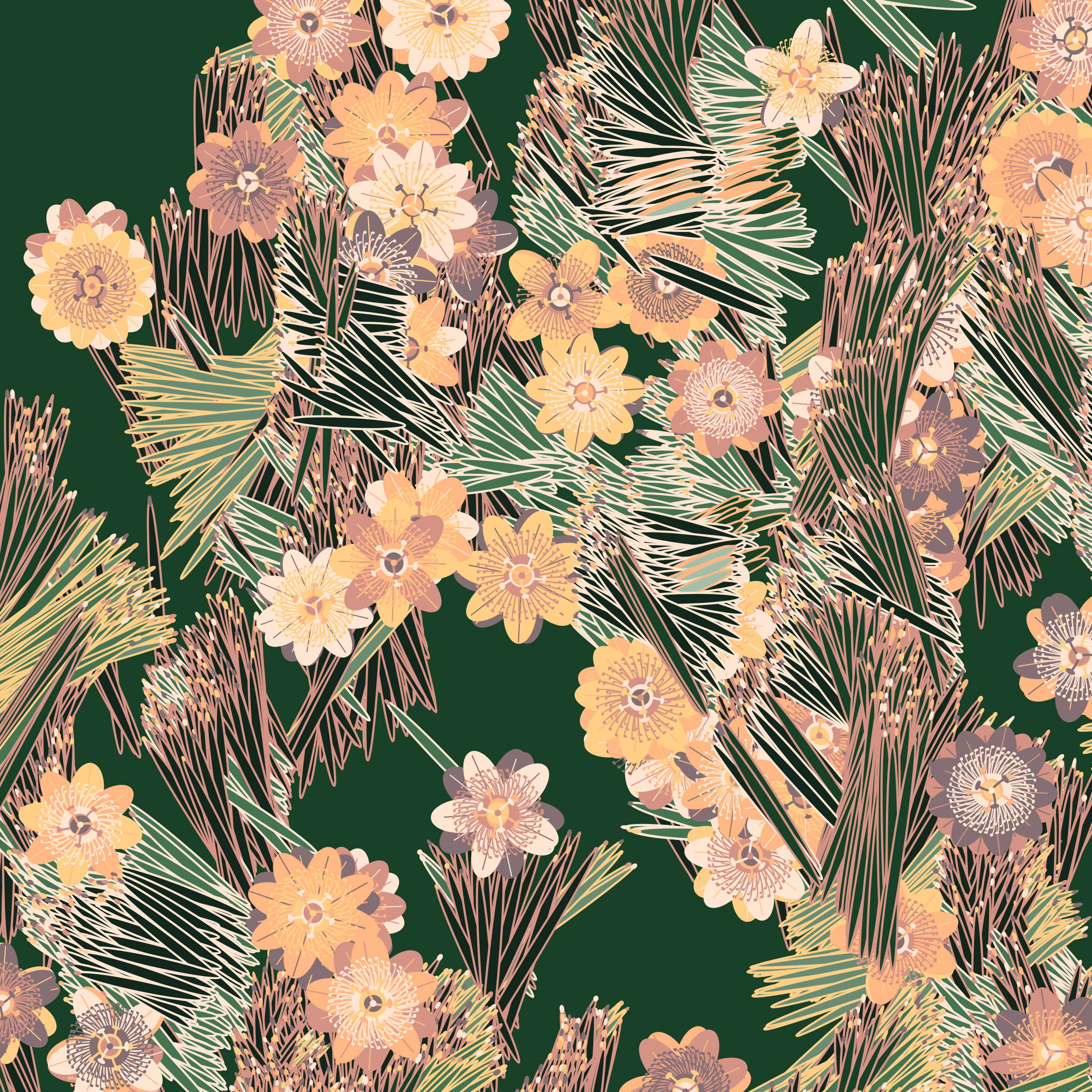 “Fragments of an infinite field” is a compositional system in which an idealized plant species is generated and arranged in a potentially infinite field of foliage. The main environmental parameter of the composition is the determination of a season of the year. The season determines the landscape’s colors and defines specific phenomena for each of them, such as rain in summer, snow in winter, petals falling in autumn, and pollen in spring. The flower has several possible variables, which can be macro aspects, affecting the entire population of the species, or micro, affecting each individual of the species differently. For example, the number of petals can be equal in all individuals or not. The number of filaments and other structures of the flower can undergo minor deviations, generating small mutations. The confusion between the figure (plant) and the background (earth, sky, other natural elements) is fascinating from a compositional point of view. The background colors are, most of the time, colors present in the figures, often breaking the boundary between them and, therefore, generating chromatic masses. In this project I also intend to research the following question: How to create parameters that resemble a living organism's growth? In this sense, the project approaches digital morphogenesis and the development of procedural organisms.