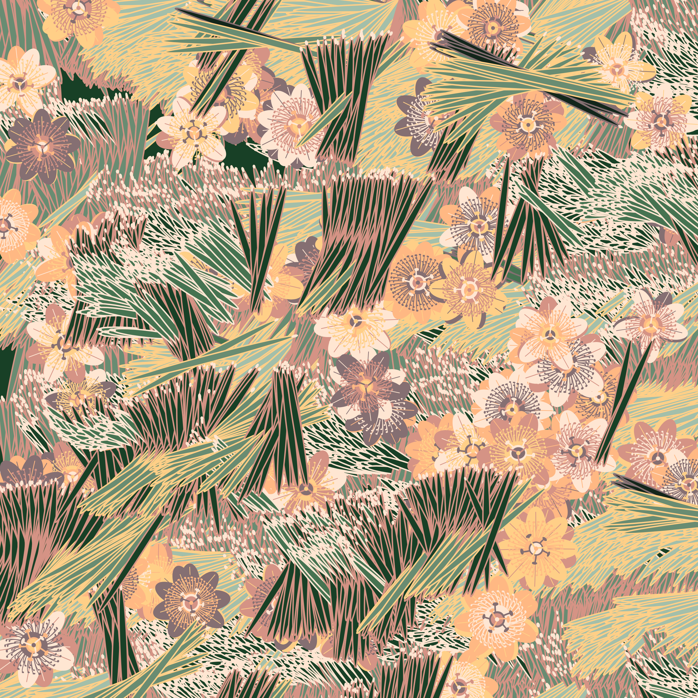 “Fragments of an infinite field” is a compositional system in which an idealized plant species is generated and arranged in a potentially infinite field of foliage. The main environmental parameter of the composition is the determination of a season of the year. The season determines the landscape’s colors and defines specific phenomena for each of them, such as rain in summer, snow in winter, petals falling in autumn, and pollen in spring. The flower has several possible variables, which can be macro aspects, affecting the entire population of the species, or micro, affecting each individual of the species differently. For example, the number of petals can be equal in all individuals or not. The number of filaments and other structures of the flower can undergo minor deviations, generating small mutations. The confusion between the figure (plant) and the background (earth, sky, other natural elements) is fascinating from a compositional point of view. The background colors are, most of the time, colors present in the figures, often breaking the boundary between them and, therefore, generating chromatic masses. In this project I also intend to research the following question: How to create parameters that resemble a living organism's growth? In this sense, the project approaches digital morphogenesis and the development of procedural organisms.