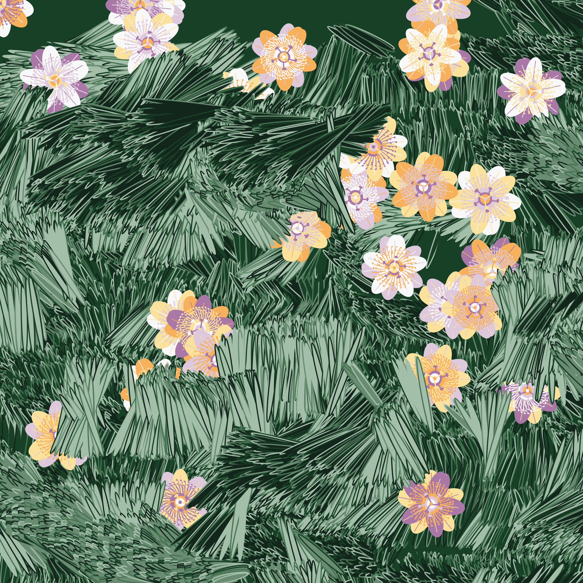 “Fragments of an infinite field” is a compositional system in which an idealized plant species is generated and arranged in a potentially infinite field of foliage. The main environmental parameter of the composition is the determination of a season of the year. The season determines the landscape’s colors and defines specific phenomena for each of them, such as rain in summer, snow in winter, petals falling in autumn, and pollen in spring. The flower has several possible variables, which can be macro aspects, affecting the entire population of the species, or micro, affecting each individual of the species differently. For example, the number of petals can be equal in all individuals or not. The number of filaments and other structures of the flower can undergo minor deviations, generating small mutations. The confusion between the figure (plant) and the background (earth, sky, other natural elements) is fascinating from a compositional point of view. The background colors are, most of the time, colors present in the figures, often breaking the boundary between them and, therefore, generating chromatic masses. In this project I also intend to research the following question: How to create parameters that resemble a living organism's growth? In this sense, the project approaches digital morphogenesis and the development of procedural organisms.