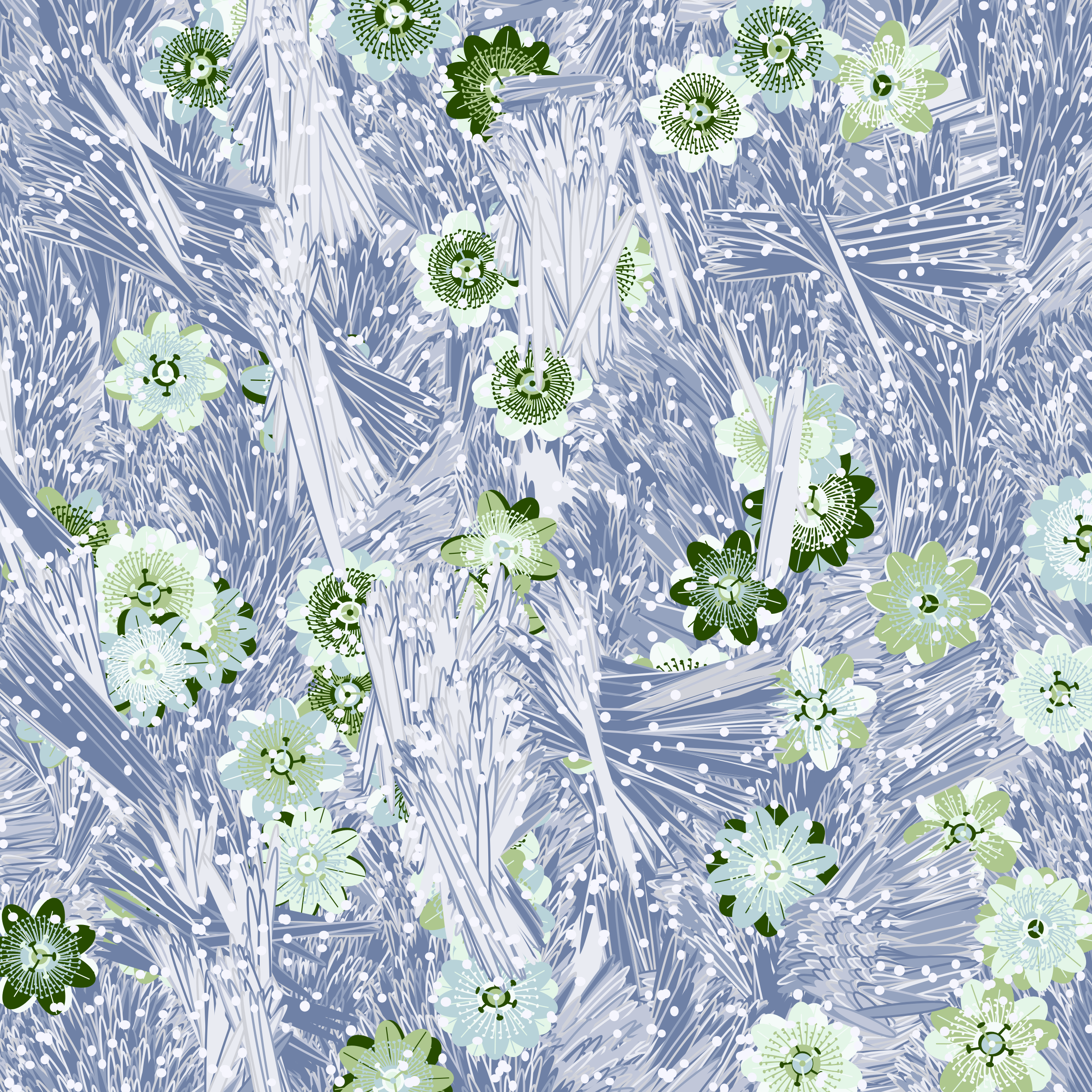 “Fragments of an infinite field” is a compositional system in which an idealized plant species is generated and arranged in a potentially infinite field of foliage. The main environmental parameter of the composition is the determination of a season of the year. The season determines the landscape’s colors and defines specific phenomena for each of them, such as rain in summer, snow in winter, petals falling in autumn, and pollen in spring. The flower has several possible variables, which can be macro aspects, affecting the entire population of the species, or micro, affecting each individual of the species differently. For example, the number of petals can be equal in all individuals or not. The number of filaments and other structures of the flower can undergo minor deviations, generating small mutations. The confusion between the figure (plant) and the background (earth, sky, other natural elements) is fascinating from a compositional point of view. The background colors are, most of the time, colors present in the figures, often breaking the boundary between them and, therefore, generating chromatic masses. In this project I also intend to research the following question: How to create parameters that resemble a living organism's growth? In this sense, the project approaches digital morphogenesis and the development of procedural organisms.