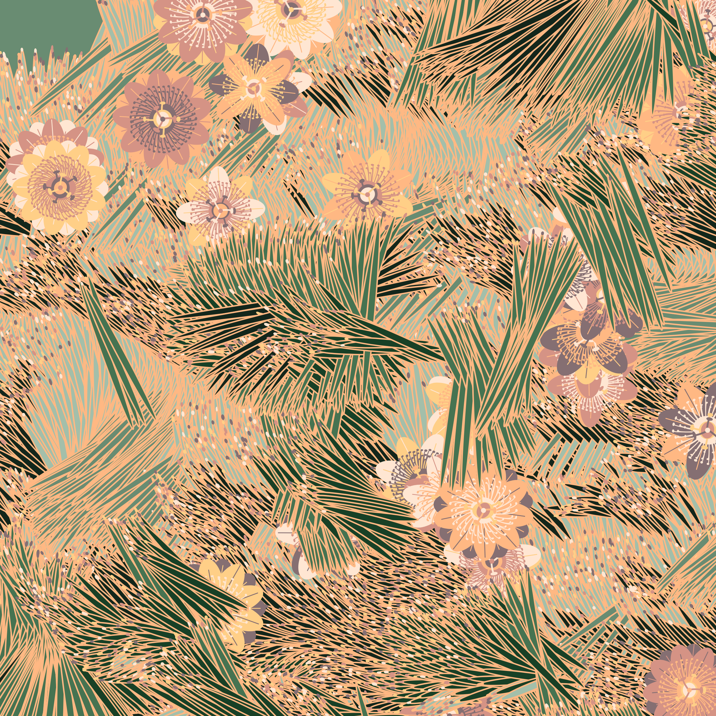 “Fragments of an infinite field” is a compositional system in which an idealized plant species is generated and arranged in a potentially infinite field of foliage. The main environmental parameter of the composition is the determination of a season of the year. The season determines the landscape’s colors and defines specific phenomena for each of them, such as rain in summer, snow in winter, petals falling in autumn, and pollen in spring. The flower has several possible variables, which can be macro aspects, affecting the entire population of the species, or micro, affecting each individual of the species differently. For example, the number of petals can be equal in all individuals or not. The number of filaments and other structures of the flower can undergo minor deviations, generating small mutations. The confusion between the figure (plant) and the background (earth, sky, other natural elements) is fascinating from a compositional point of view. The background colors are, most of the time, colors present in the figures, often breaking the boundary between them and, therefore, generating chromatic masses. In this project I also intend to research the following question: How to create parameters that resemble a living organism's growth? In this sense, the project approaches digital morphogenesis and the development of procedural organisms.