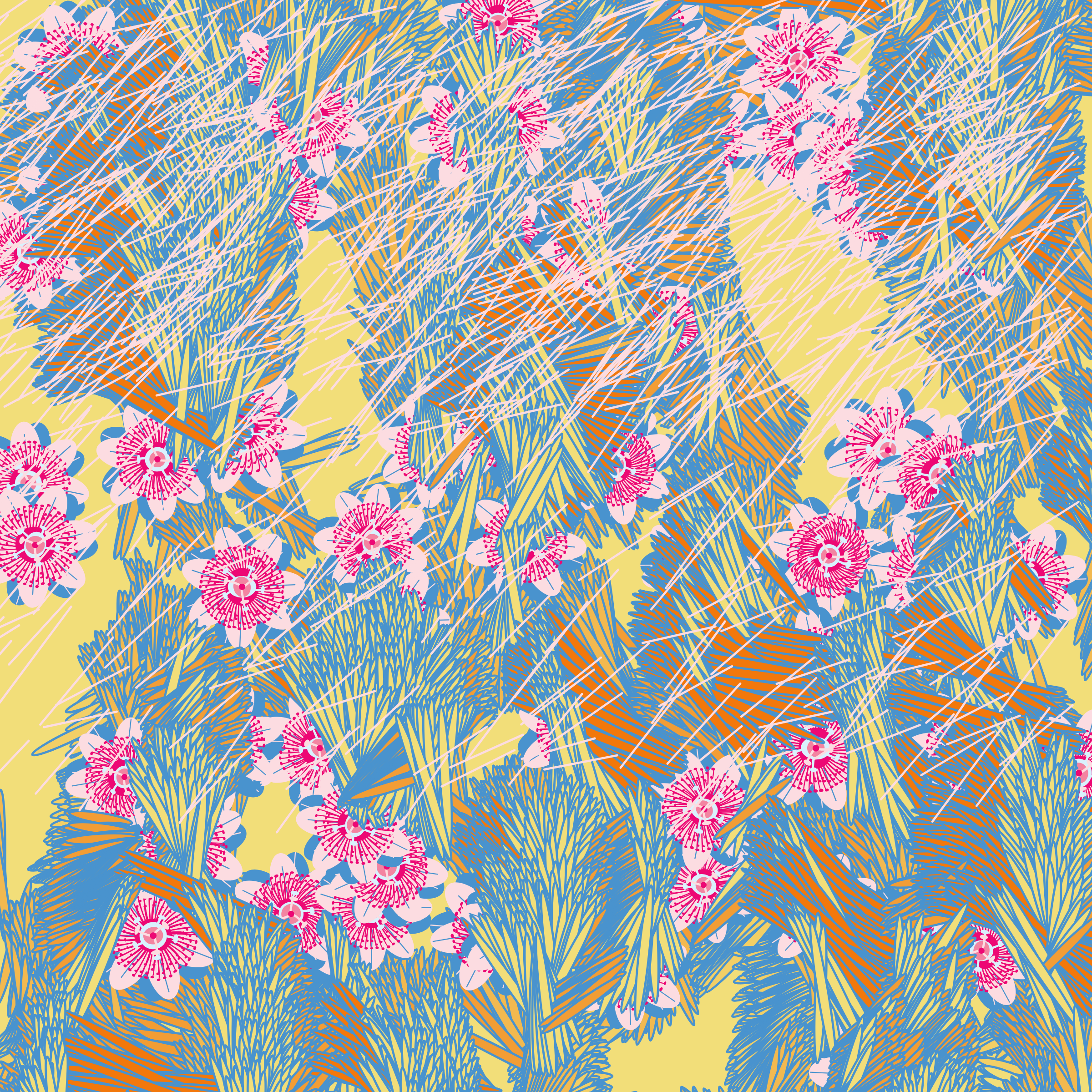 “Fragments of an infinite field” is a compositional system in which an idealized plant species is generated and arranged in a potentially infinite field of foliage. The main environmental parameter of the composition is the determination of a season of the year. The season determines the landscape’s colors and defines specific phenomena for each of them, such as rain in summer, snow in winter, petals falling in autumn, and pollen in spring. The flower has several possible variables, which can be macro aspects, affecting the entire population of the species, or micro, affecting each individual of the species differently. For example, the number of petals can be equal in all individuals or not. The number of filaments and other structures of the flower can undergo minor deviations, generating small mutations. The confusion between the figure (plant) and the background (earth, sky, other natural elements) is fascinating from a compositional point of view. The background colors are, most of the time, colors present in the figures, often breaking the boundary between them and, therefore, generating chromatic masses. In this project I also intend to research the following question: How to create parameters that resemble a living organism's growth? In this sense, the project approaches digital morphogenesis and the development of procedural organisms.