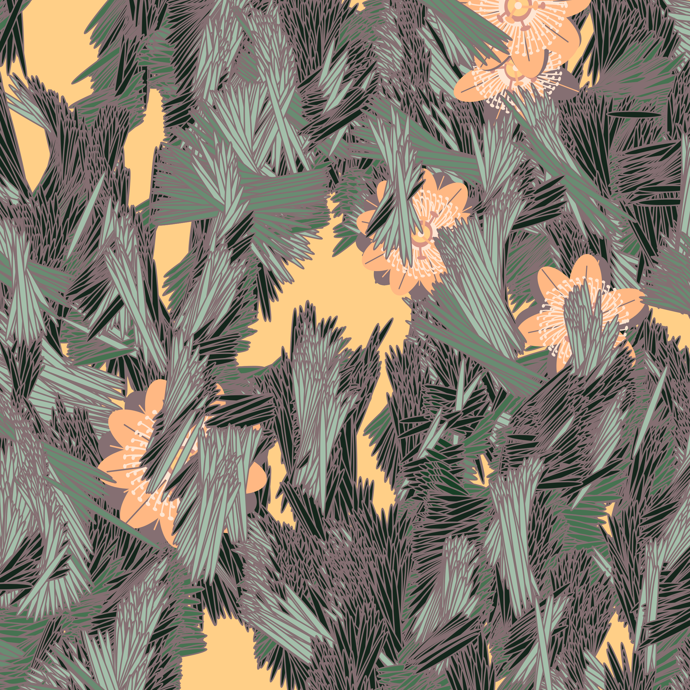 “Fragments of an infinite field” is a compositional system in which an idealized plant species is generated and arranged in a potentially infinite field of foliage. The main environmental parameter of the composition is the determination of a season of the year. The season determines the landscape’s colors and defines specific phenomena for each of them, such as rain in summer, snow in winter, petals falling in autumn, and pollen in spring. The flower has several possible variables, which can be macro aspects, affecting the entire population of the species, or micro, affecting each individual of the species differently. For example, the number of petals can be equal in all individuals or not. The number of filaments and other structures of the flower can undergo minor deviations, generating small mutations. The confusion between the figure (plant) and the background (earth, sky, other natural elements) is fascinating from a compositional point of view. The background colors are, most of the time, colors present in the figures, often breaking the boundary between them and, therefore, generating chromatic masses. In this project I also intend to research the following question: How to create parameters that resemble a living organism's growth? In this sense, the project approaches digital morphogenesis and the development of procedural organisms.