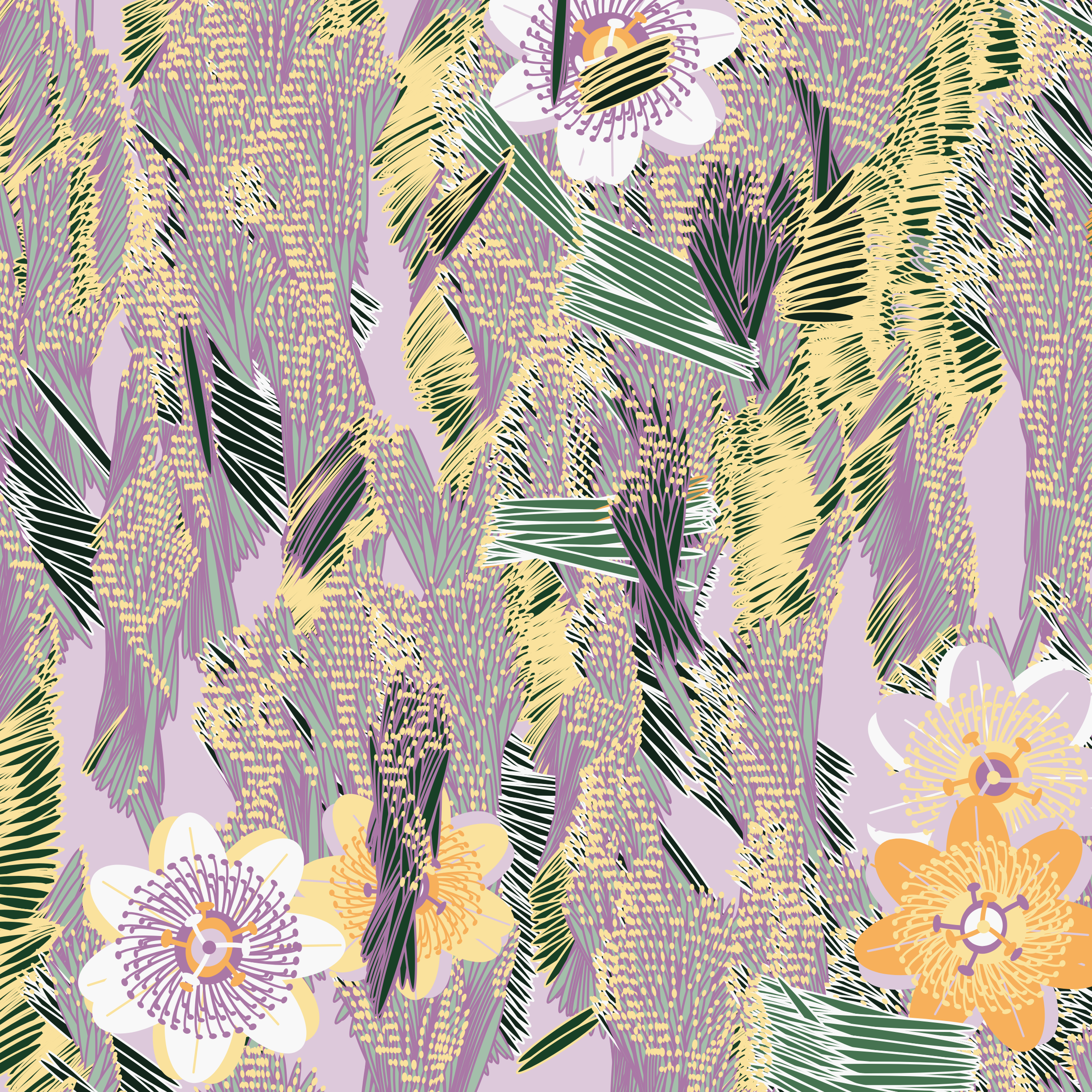 “Fragments of an infinite field” is a compositional system in which an idealized plant species is generated and arranged in a potentially infinite field of foliage. The main environmental parameter of the composition is the determination of a season of the year. The season determines the landscape’s colors and defines specific phenomena for each of them, such as rain in summer, snow in winter, petals falling in autumn, and pollen in spring. The flower has several possible variables, which can be macro aspects, affecting the entire population of the species, or micro, affecting each individual of the species differently. For example, the number of petals can be equal in all individuals or not. The number of filaments and other structures of the flower can undergo minor deviations, generating small mutations. The confusion between the figure (plant) and the background (earth, sky, other natural elements) is fascinating from a compositional point of view. The background colors are, most of the time, colors present in the figures, often breaking the boundary between them and, therefore, generating chromatic masses. In this project I also intend to research the following question: How to create parameters that resemble a living organism's growth? In this sense, the project approaches digital morphogenesis and the development of procedural organisms.