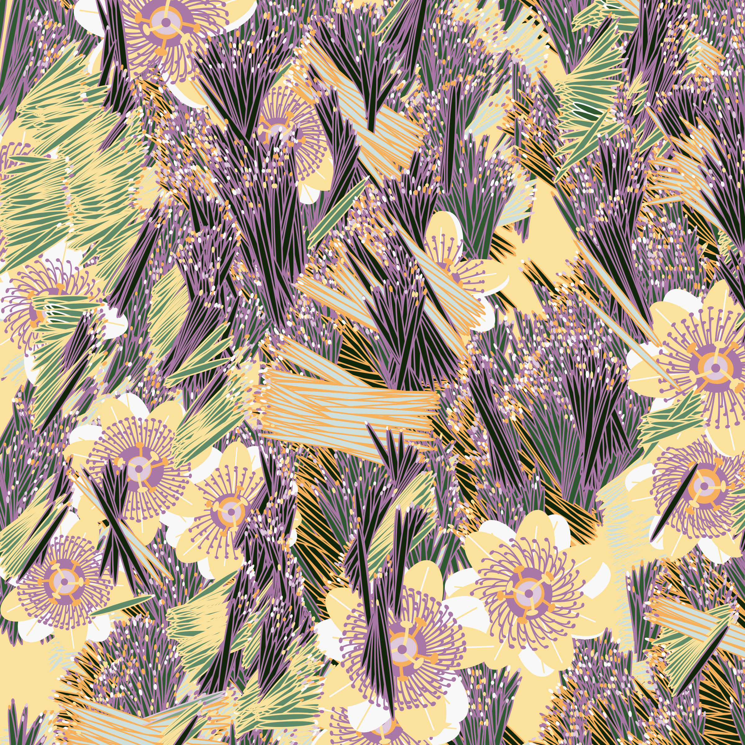 “Fragments of an infinite field” is a compositional system in which an idealized plant species is generated and arranged in a potentially infinite field of foliage. The main environmental parameter of the composition is the determination of a season of the year. The season determines the landscape’s colors and defines specific phenomena for each of them, such as rain in summer, snow in winter, petals falling in autumn, and pollen in spring. The flower has several possible variables, which can be macro aspects, affecting the entire population of the species, or micro, affecting each individual of the species differently. For example, the number of petals can be equal in all individuals or not. The number of filaments and other structures of the flower can undergo minor deviations, generating small mutations. The confusion between the figure (plant) and the background (earth, sky, other natural elements) is fascinating from a compositional point of view. The background colors are, most of the time, colors present in the figures, often breaking the boundary between them and, therefore, generating chromatic masses. In this project I also intend to research the following question: How to create parameters that resemble a living organism's growth? In this sense, the project approaches digital morphogenesis and the development of procedural organisms.