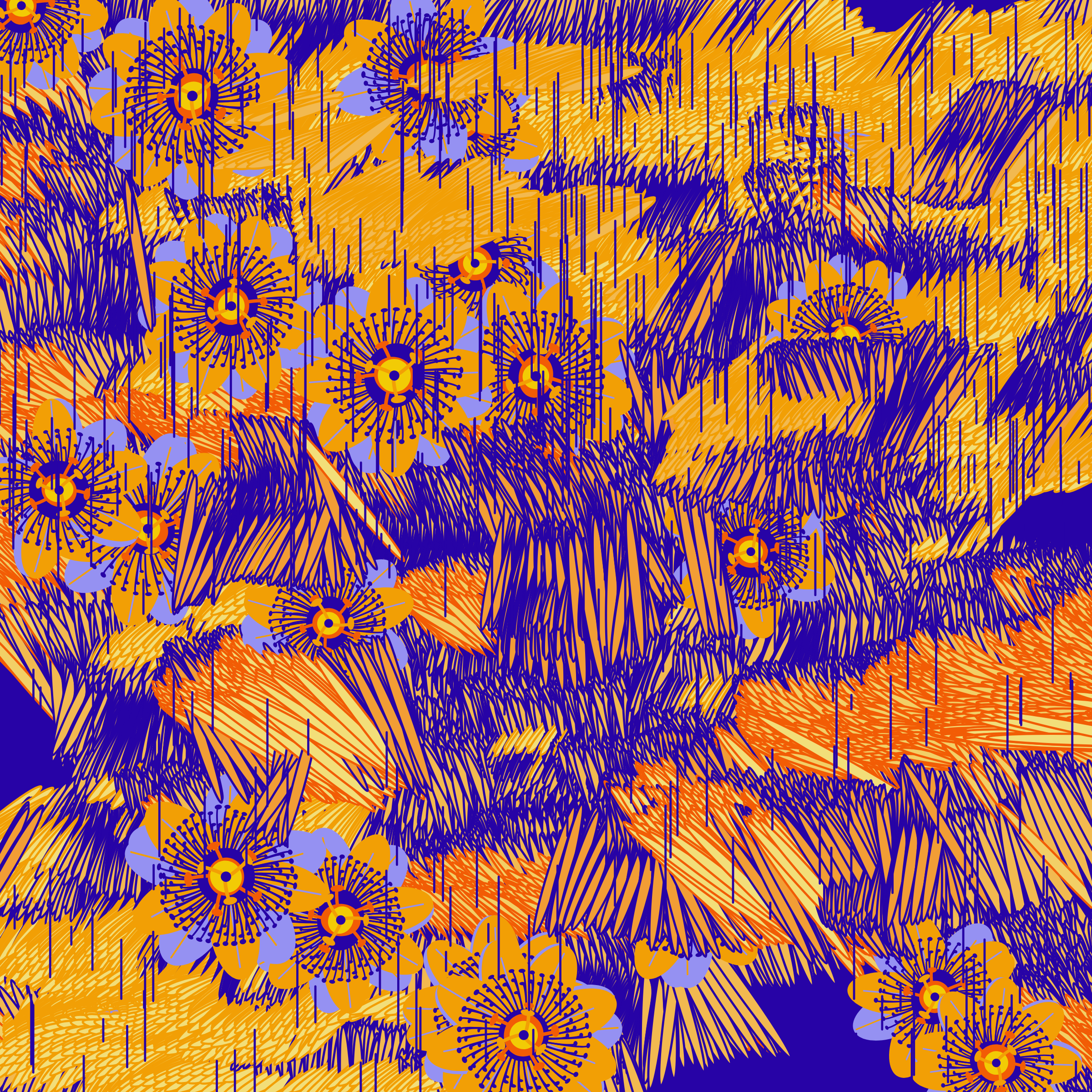 “Fragments of an infinite field” is a compositional system in which an idealized plant species is generated and arranged in a potentially infinite field of foliage. The main environmental parameter of the composition is the determination of a season of the year. The season determines the landscape’s colors and defines specific phenomena for each of them, such as rain in summer, snow in winter, petals falling in autumn, and pollen in spring. The flower has several possible variables, which can be macro aspects, affecting the entire population of the species, or micro, affecting each individual of the species differently. For example, the number of petals can be equal in all individuals or not. The number of filaments and other structures of the flower can undergo minor deviations, generating small mutations. The confusion between the figure (plant) and the background (earth, sky, other natural elements) is fascinating from a compositional point of view. The background colors are, most of the time, colors present in the figures, often breaking the boundary between them and, therefore, generating chromatic masses. In this project I also intend to research the following question: How to create parameters that resemble a living organism's growth? In this sense, the project approaches digital morphogenesis and the development of procedural organisms.