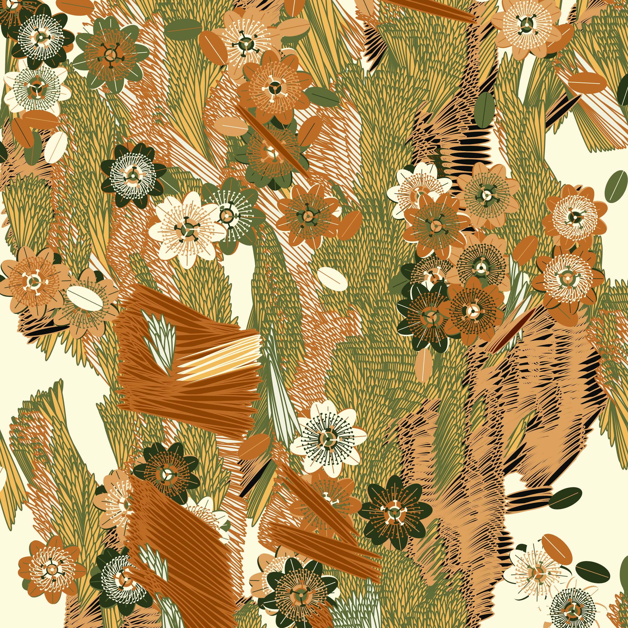 “Fragments of an infinite field” is a compositional system in which an idealized plant species is generated and arranged in a potentially infinite field of foliage. The main environmental parameter of the composition is the determination of a season of the year. The season determines the landscape’s colors and defines specific phenomena for each of them, such as rain in summer, snow in winter, petals falling in autumn, and pollen in spring. The flower has several possible variables, which can be macro aspects, affecting the entire population of the species, or micro, affecting each individual of the species differently. For example, the number of petals can be equal in all individuals or not. The number of filaments and other structures of the flower can undergo minor deviations, generating small mutations. The confusion between the figure (plant) and the background (earth, sky, other natural elements) is fascinating from a compositional point of view. The background colors are, most of the time, colors present in the figures, often breaking the boundary between them and, therefore, generating chromatic masses. In this project I also intend to research the following question: How to create parameters that resemble a living organism's growth? In this sense, the project approaches digital morphogenesis and the development of procedural organisms.
