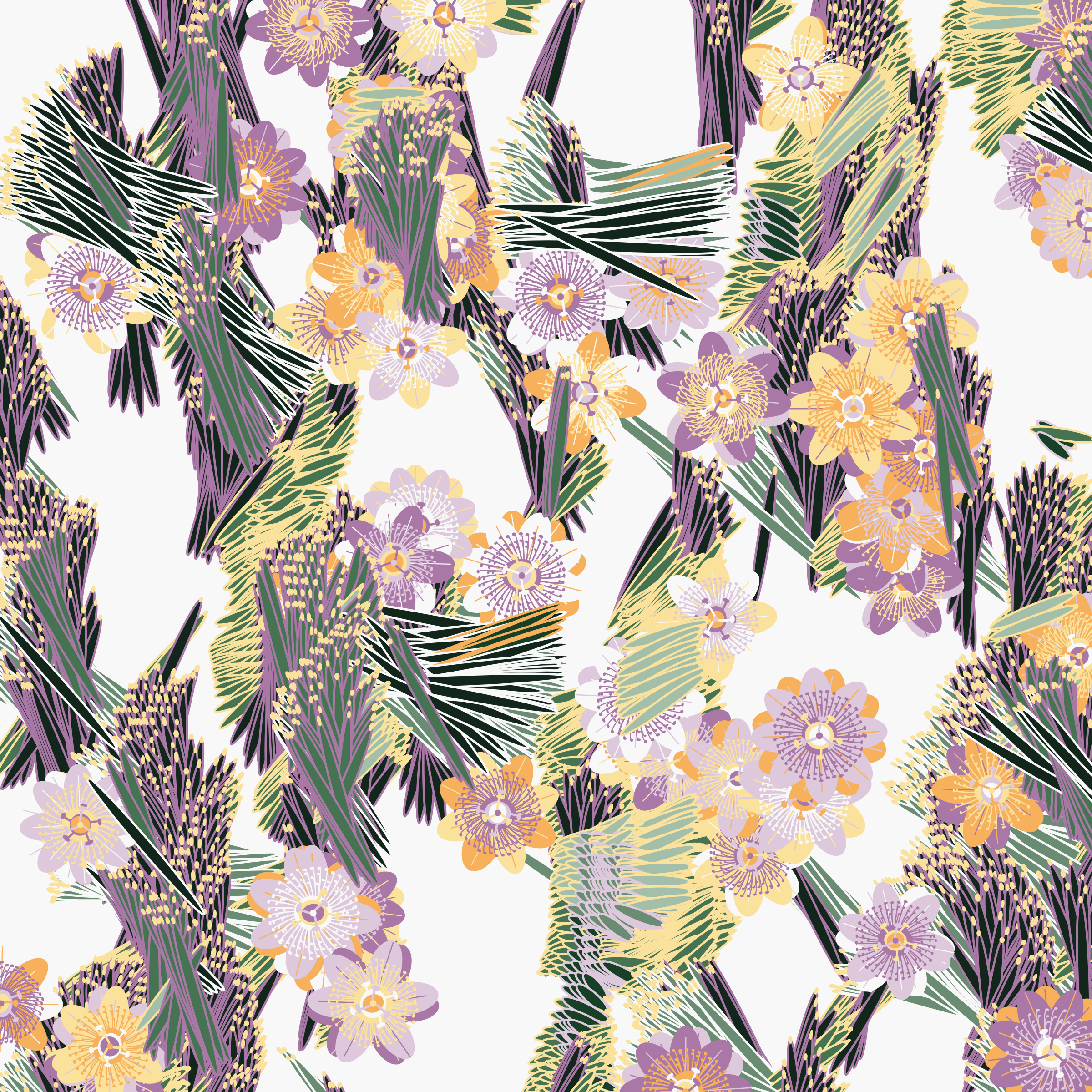 “Fragments of an infinite field” is a compositional system in which an idealized plant species is generated and arranged in a potentially infinite field of foliage. The main environmental parameter of the composition is the determination of a season of the year. The season determines the landscape’s colors and defines specific phenomena for each of them, such as rain in summer, snow in winter, petals falling in autumn, and pollen in spring. The flower has several possible variables, which can be macro aspects, affecting the entire population of the species, or micro, affecting each individual of the species differently. For example, the number of petals can be equal in all individuals or not. The number of filaments and other structures of the flower can undergo minor deviations, generating small mutations. The confusion between the figure (plant) and the background (earth, sky, other natural elements) is fascinating from a compositional point of view. The background colors are, most of the time, colors present in the figures, often breaking the boundary between them and, therefore, generating chromatic masses. In this project I also intend to research the following question: How to create parameters that resemble a living organism's growth? In this sense, the project approaches digital morphogenesis and the development of procedural organisms.