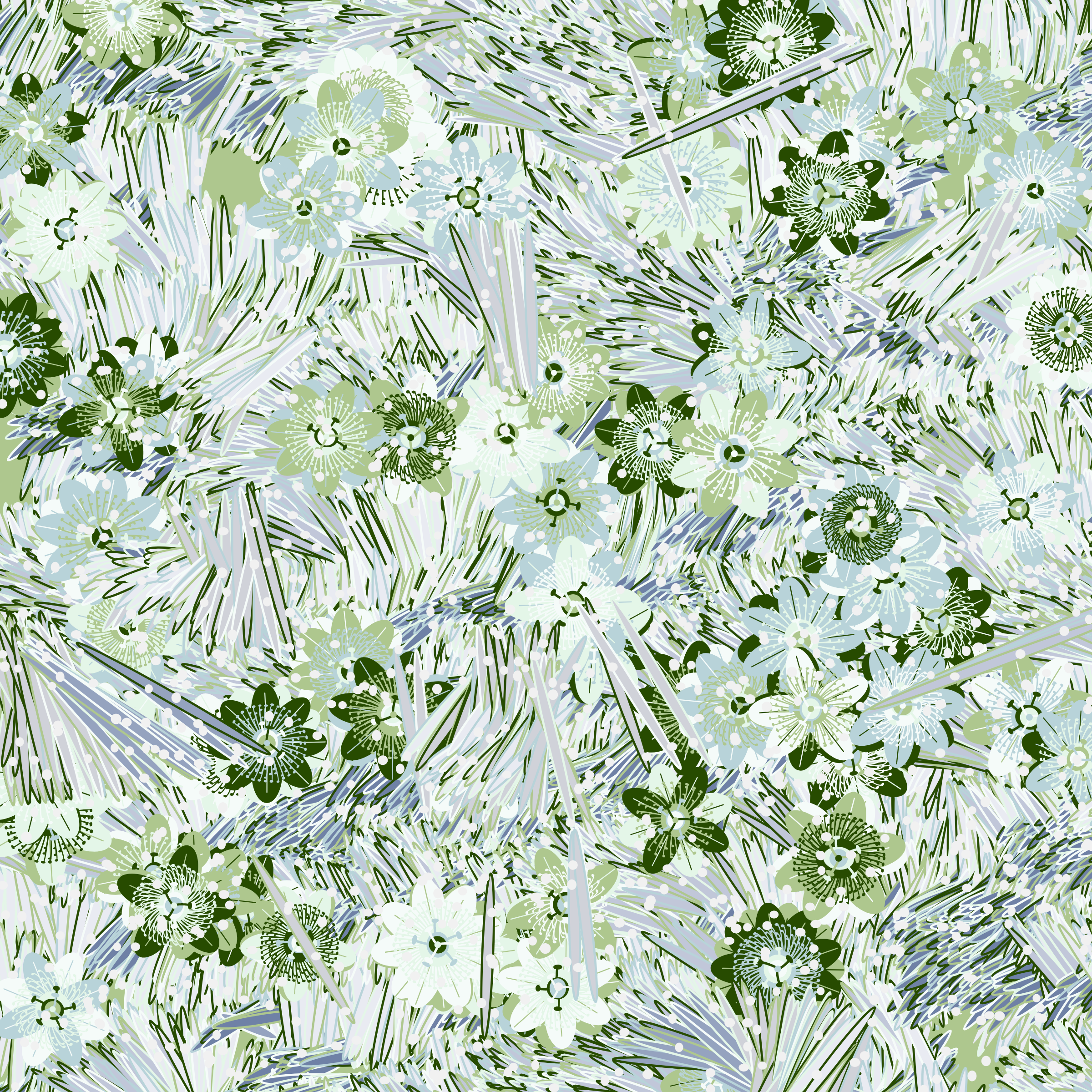 “Fragments of an infinite field” is a compositional system in which an idealized plant species is generated and arranged in a potentially infinite field of foliage. The main environmental parameter of the composition is the determination of a season of the year. The season determines the landscape’s colors and defines specific phenomena for each of them, such as rain in summer, snow in winter, petals falling in autumn, and pollen in spring. The flower has several possible variables, which can be macro aspects, affecting the entire population of the species, or micro, affecting each individual of the species differently. For example, the number of petals can be equal in all individuals or not. The number of filaments and other structures of the flower can undergo minor deviations, generating small mutations. The confusion between the figure (plant) and the background (earth, sky, other natural elements) is fascinating from a compositional point of view. The background colors are, most of the time, colors present in the figures, often breaking the boundary between them and, therefore, generating chromatic masses. In this project I also intend to research the following question: How to create parameters that resemble a living organism's growth? In this sense, the project approaches digital morphogenesis and the development of procedural organisms.