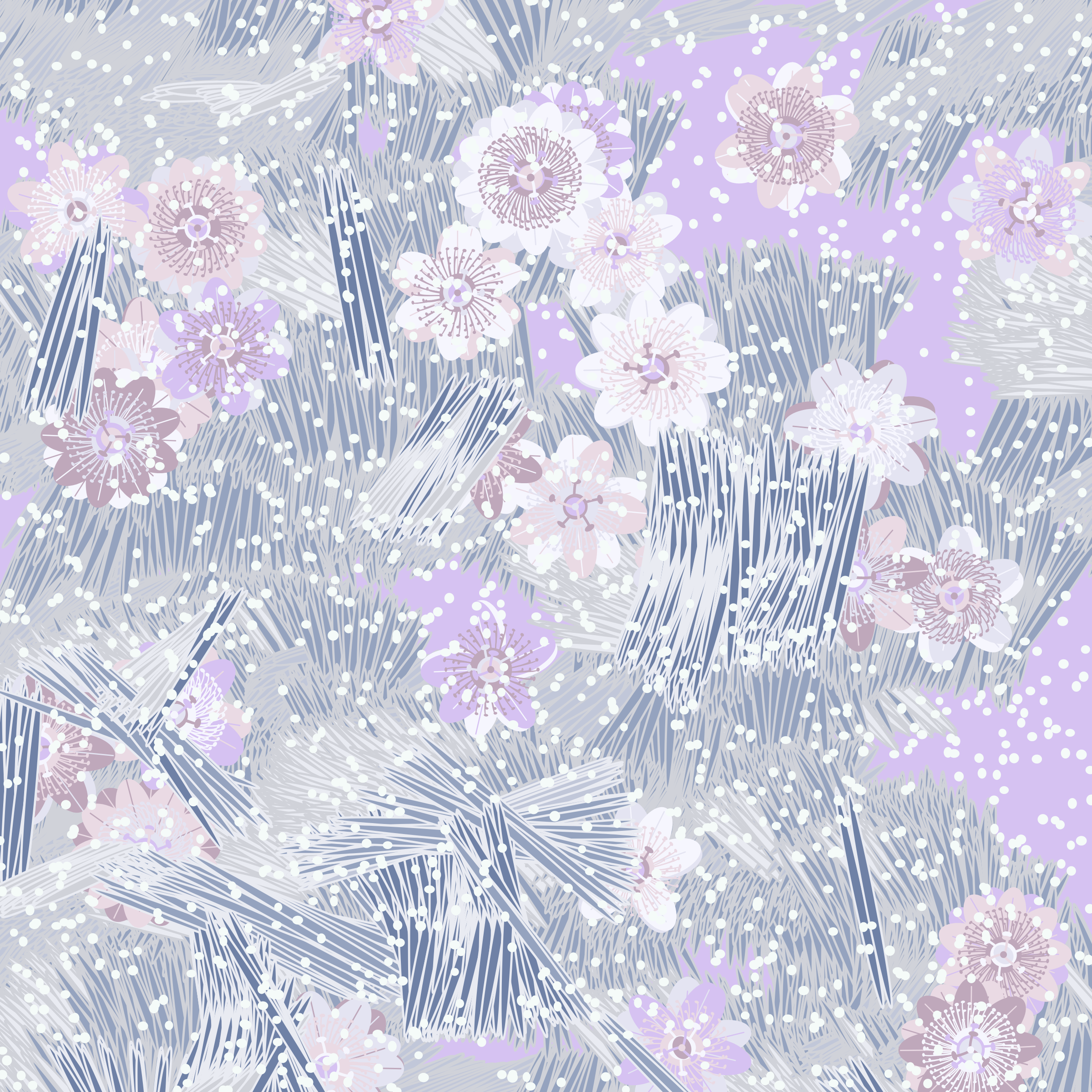 “Fragments of an infinite field” is a compositional system in which an idealized plant species is generated and arranged in a potentially infinite field of foliage. The main environmental parameter of the composition is the determination of a season of the year. The season determines the landscape’s colors and defines specific phenomena for each of them, such as rain in summer, snow in winter, petals falling in autumn, and pollen in spring. The flower has several possible variables, which can be macro aspects, affecting the entire population of the species, or micro, affecting each individual of the species differently. For example, the number of petals can be equal in all individuals or not. The number of filaments and other structures of the flower can undergo minor deviations, generating small mutations. The confusion between the figure (plant) and the background (earth, sky, other natural elements) is fascinating from a compositional point of view. The background colors are, most of the time, colors present in the figures, often breaking the boundary between them and, therefore, generating chromatic masses. In this project I also intend to research the following question: How to create parameters that resemble a living organism's growth? In this sense, the project approaches digital morphogenesis and the development of procedural organisms.