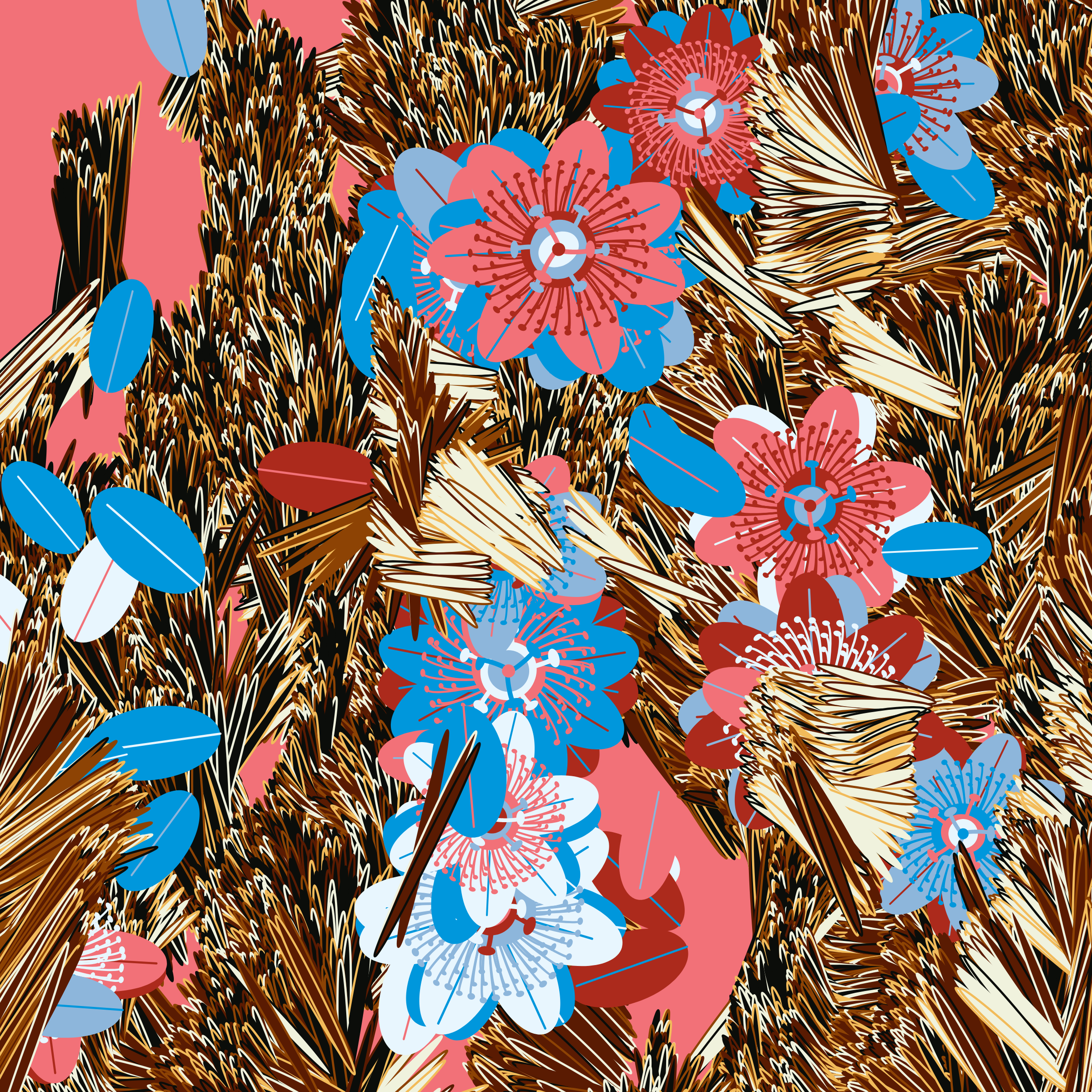 “Fragments of an infinite field” is a compositional system in which an idealized plant species is generated and arranged in a potentially infinite field of foliage. The main environmental parameter of the composition is the determination of a season of the year. The season determines the landscape’s colors and defines specific phenomena for each of them, such as rain in summer, snow in winter, petals falling in autumn, and pollen in spring. The flower has several possible variables, which can be macro aspects, affecting the entire population of the species, or micro, affecting each individual of the species differently. For example, the number of petals can be equal in all individuals or not. The number of filaments and other structures of the flower can undergo minor deviations, generating small mutations. The confusion between the figure (plant) and the background (earth, sky, other natural elements) is fascinating from a compositional point of view. The background colors are, most of the time, colors present in the figures, often breaking the boundary between them and, therefore, generating chromatic masses. In this project I also intend to research the following question: How to create parameters that resemble a living organism's growth? In this sense, the project approaches digital morphogenesis and the development of procedural organisms.
