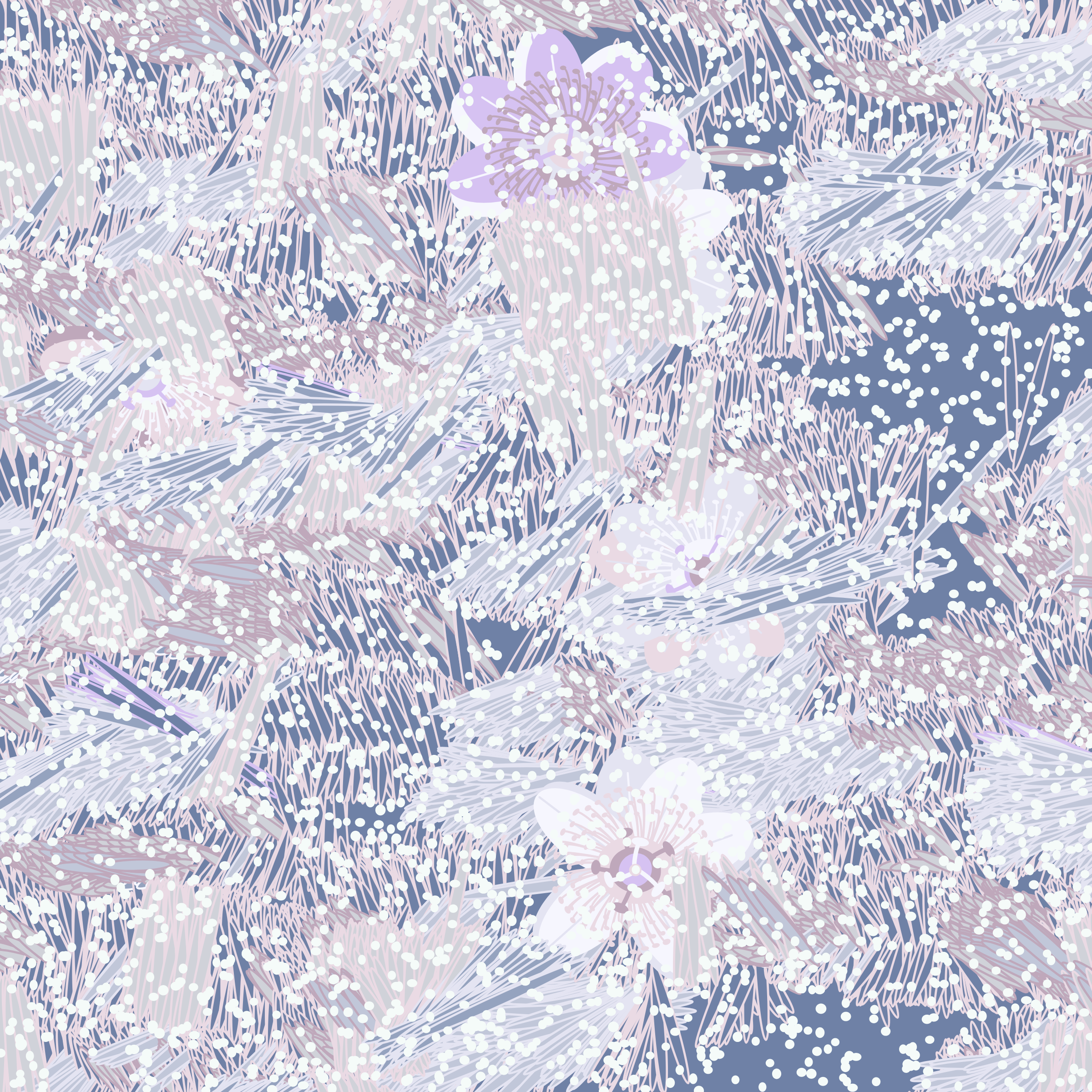 “Fragments of an infinite field” is a compositional system in which an idealized plant species is generated and arranged in a potentially infinite field of foliage. The main environmental parameter of the composition is the determination of a season of the year. The season determines the landscape’s colors and defines specific phenomena for each of them, such as rain in summer, snow in winter, petals falling in autumn, and pollen in spring. The flower has several possible variables, which can be macro aspects, affecting the entire population of the species, or micro, affecting each individual of the species differently. For example, the number of petals can be equal in all individuals or not. The number of filaments and other structures of the flower can undergo minor deviations, generating small mutations. The confusion between the figure (plant) and the background (earth, sky, other natural elements) is fascinating from a compositional point of view. The background colors are, most of the time, colors present in the figures, often breaking the boundary between them and, therefore, generating chromatic masses. In this project I also intend to research the following question: How to create parameters that resemble a living organism's growth? In this sense, the project approaches digital morphogenesis and the development of procedural organisms.