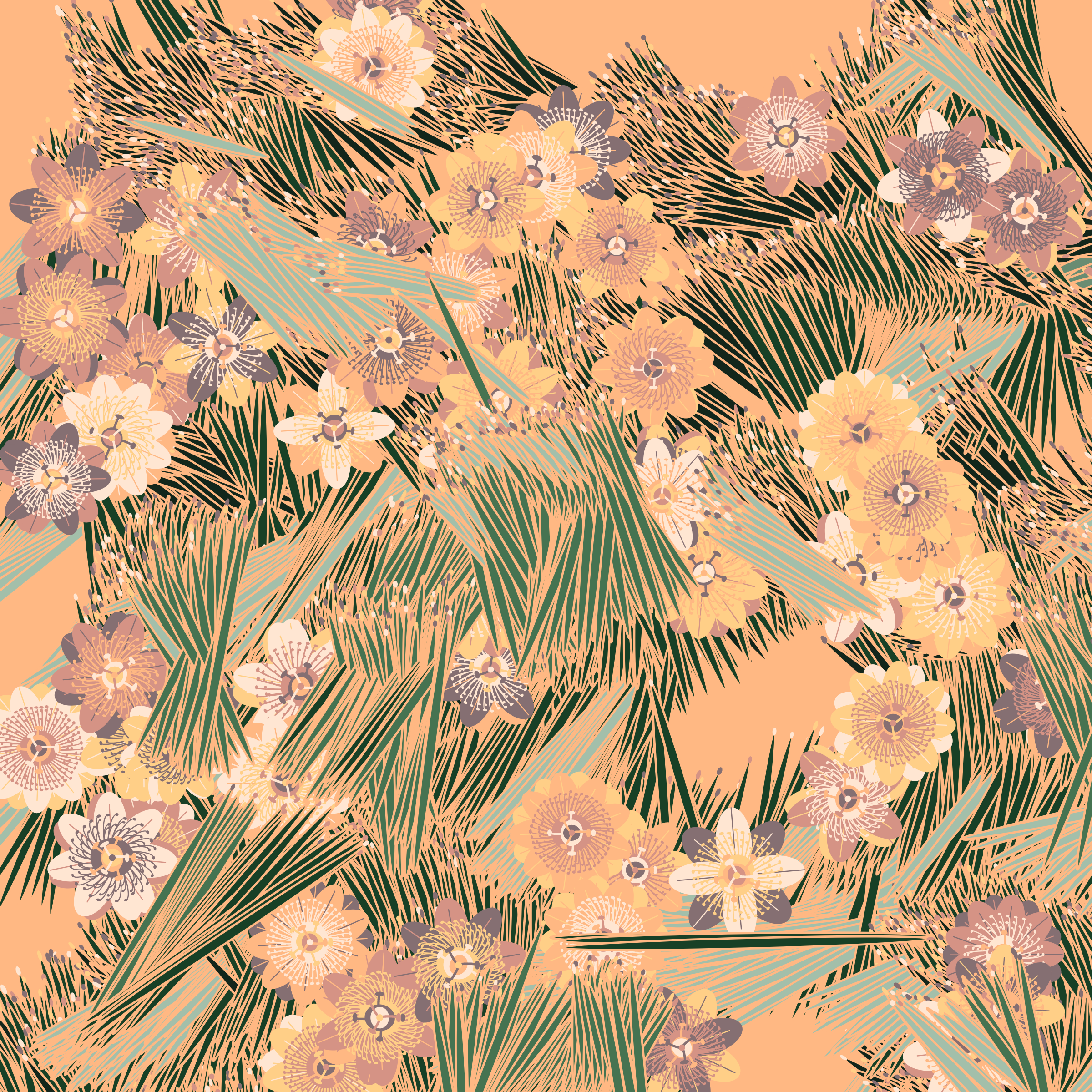 “Fragments of an infinite field” is a compositional system in which an idealized plant species is generated and arranged in a potentially infinite field of foliage. The main environmental parameter of the composition is the determination of a season of the year. The season determines the landscape’s colors and defines specific phenomena for each of them, such as rain in summer, snow in winter, petals falling in autumn, and pollen in spring. The flower has several possible variables, which can be macro aspects, affecting the entire population of the species, or micro, affecting each individual of the species differently. For example, the number of petals can be equal in all individuals or not. The number of filaments and other structures of the flower can undergo minor deviations, generating small mutations. The confusion between the figure (plant) and the background (earth, sky, other natural elements) is fascinating from a compositional point of view. The background colors are, most of the time, colors present in the figures, often breaking the boundary between them and, therefore, generating chromatic masses. In this project I also intend to research the following question: How to create parameters that resemble a living organism's growth? In this sense, the project approaches digital morphogenesis and the development of procedural organisms.