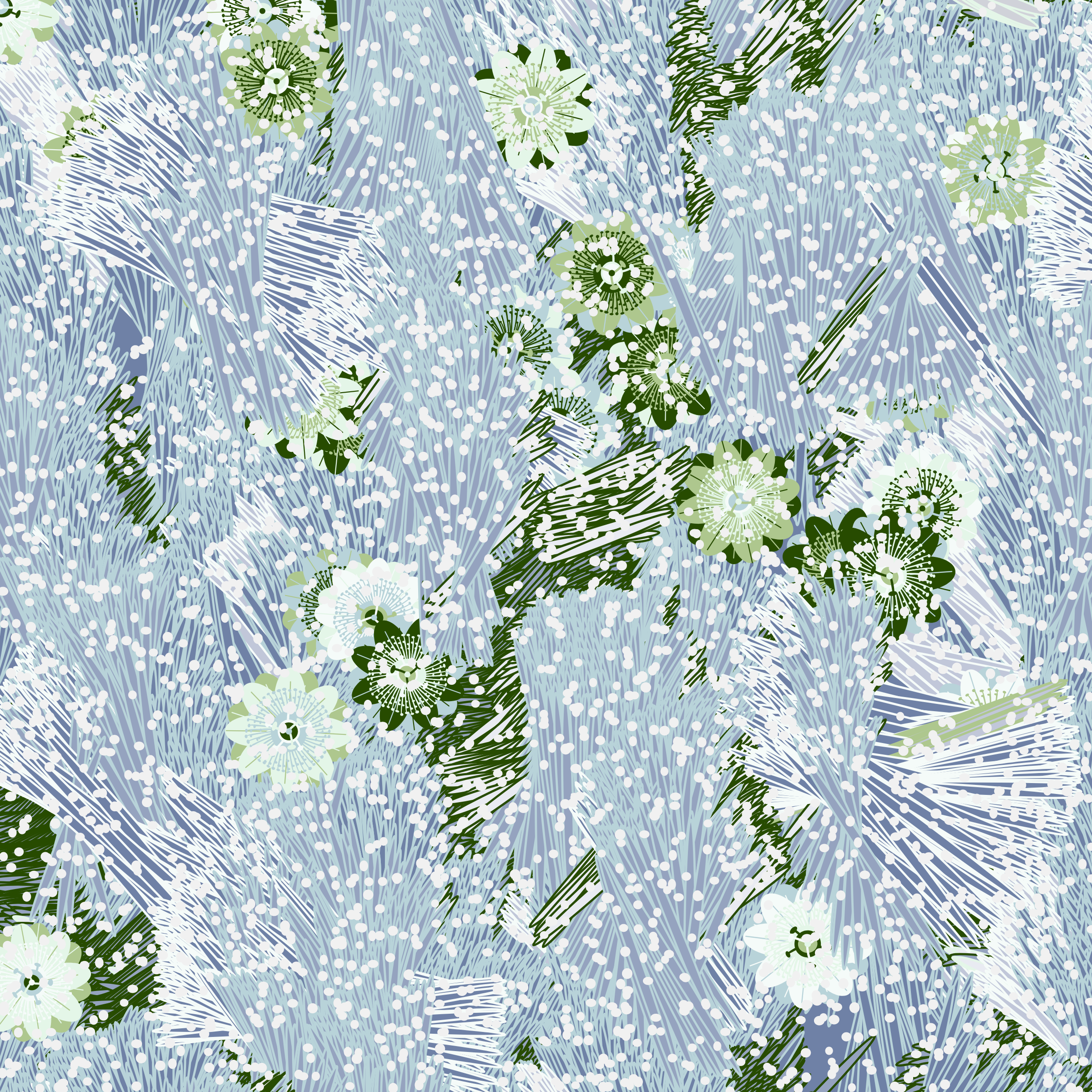 “Fragments of an infinite field” is a compositional system in which an idealized plant species is generated and arranged in a potentially infinite field of foliage. The main environmental parameter of the composition is the determination of a season of the year. The season determines the landscape’s colors and defines specific phenomena for each of them, such as rain in summer, snow in winter, petals falling in autumn, and pollen in spring. The flower has several possible variables, which can be macro aspects, affecting the entire population of the species, or micro, affecting each individual of the species differently. For example, the number of petals can be equal in all individuals or not. The number of filaments and other structures of the flower can undergo minor deviations, generating small mutations. The confusion between the figure (plant) and the background (earth, sky, other natural elements) is fascinating from a compositional point of view. The background colors are, most of the time, colors present in the figures, often breaking the boundary between them and, therefore, generating chromatic masses. In this project I also intend to research the following question: How to create parameters that resemble a living organism's growth? In this sense, the project approaches digital morphogenesis and the development of procedural organisms.