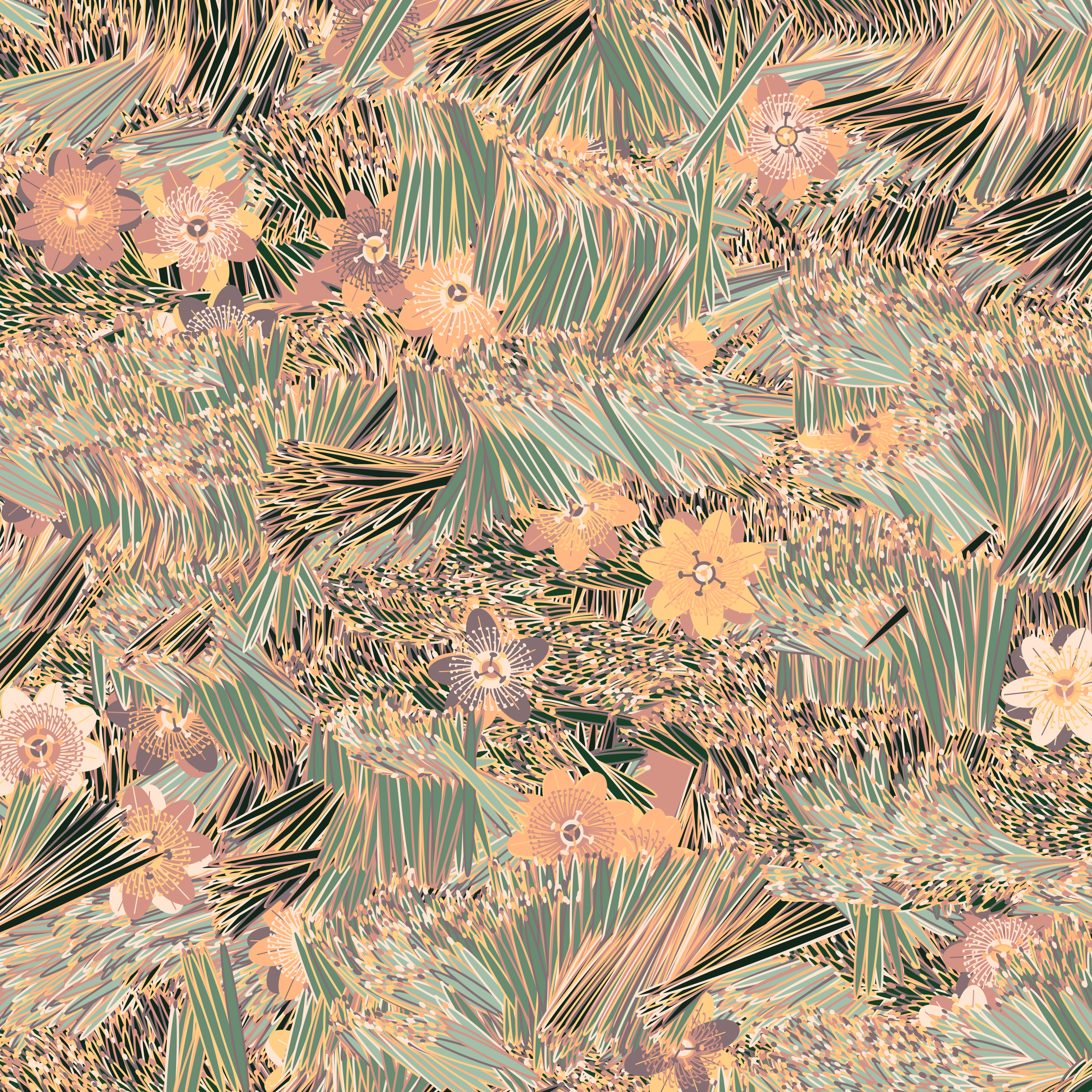“Fragments of an infinite field” is a compositional system in which an idealized plant species is generated and arranged in a potentially infinite field of foliage. The main environmental parameter of the composition is the determination of a season of the year. The season determines the landscape’s colors and defines specific phenomena for each of them, such as rain in summer, snow in winter, petals falling in autumn, and pollen in spring. The flower has several possible variables, which can be macro aspects, affecting the entire population of the species, or micro, affecting each individual of the species differently. For example, the number of petals can be equal in all individuals or not. The number of filaments and other structures of the flower can undergo minor deviations, generating small mutations. The confusion between the figure (plant) and the background (earth, sky, other natural elements) is fascinating from a compositional point of view. The background colors are, most of the time, colors present in the figures, often breaking the boundary between them and, therefore, generating chromatic masses. In this project I also intend to research the following question: How to create parameters that resemble a living organism's growth? In this sense, the project approaches digital morphogenesis and the development of procedural organisms.