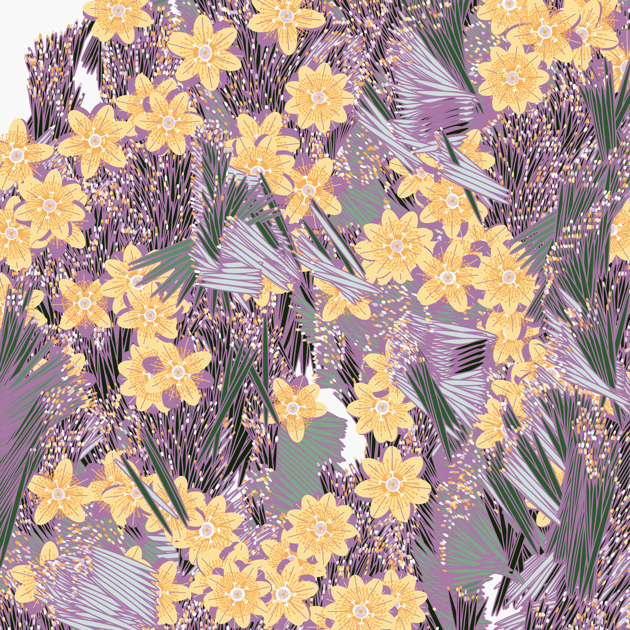 “Fragments of an infinite field” is a compositional system in which an idealized plant species is generated and arranged in a potentially infinite field of foliage. The main environmental parameter of the composition is the determination of a season of the year. The season determines the landscape’s colors and defines specific phenomena for each of them, such as rain in summer, snow in winter, petals falling in autumn, and pollen in spring. The flower has several possible variables, which can be macro aspects, affecting the entire population of the species, or micro, affecting each individual of the species differently. For example, the number of petals can be equal in all individuals or not. The number of filaments and other structures of the flower can undergo minor deviations, generating small mutations. The confusion between the figure (plant) and the background (earth, sky, other natural elements) is fascinating from a compositional point of view. The background colors are, most of the time, colors present in the figures, often breaking the boundary between them and, therefore, generating chromatic masses. In this project I also intend to research the following question: How to create parameters that resemble a living organism's growth? In this sense, the project approaches digital morphogenesis and the development of procedural organisms.