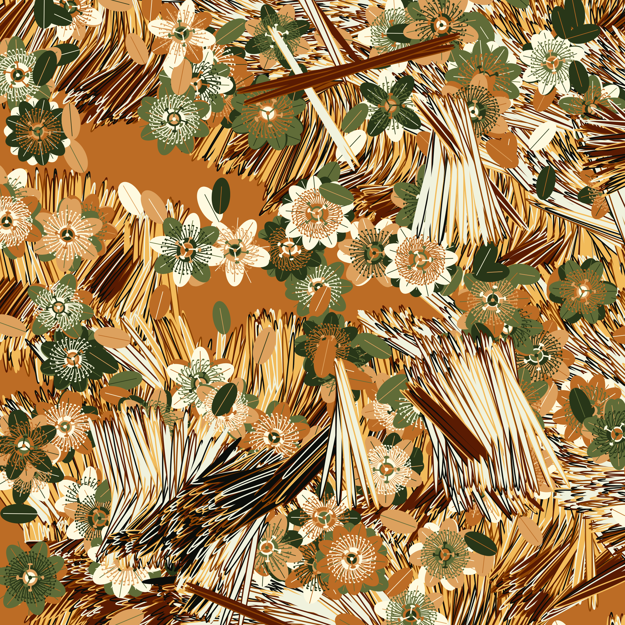 “Fragments of an infinite field” is a compositional system in which an idealized plant species is generated and arranged in a potentially infinite field of foliage. The main environmental parameter of the composition is the determination of a season of the year. The season determines the landscape’s colors and defines specific phenomena for each of them, such as rain in summer, snow in winter, petals falling in autumn, and pollen in spring. The flower has several possible variables, which can be macro aspects, affecting the entire population of the species, or micro, affecting each individual of the species differently. For example, the number of petals can be equal in all individuals or not. The number of filaments and other structures of the flower can undergo minor deviations, generating small mutations. The confusion between the figure (plant) and the background (earth, sky, other natural elements) is fascinating from a compositional point of view. The background colors are, most of the time, colors present in the figures, often breaking the boundary between them and, therefore, generating chromatic masses. In this project I also intend to research the following question: How to create parameters that resemble a living organism's growth? In this sense, the project approaches digital morphogenesis and the development of procedural organisms.