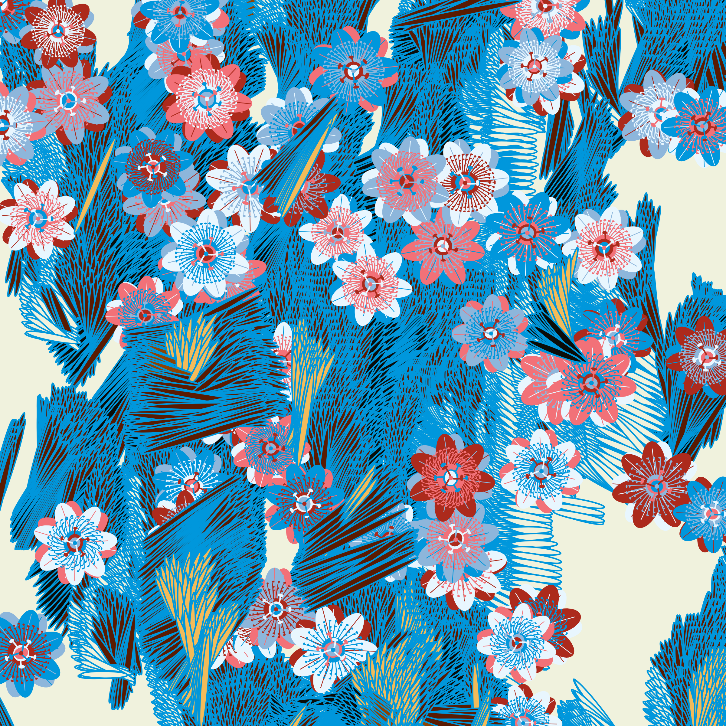 “Fragments of an infinite field” is a compositional system in which an idealized plant species is generated and arranged in a potentially infinite field of foliage. The main environmental parameter of the composition is the determination of a season of the year. The season determines the landscape’s colors and defines specific phenomena for each of them, such as rain in summer, snow in winter, petals falling in autumn, and pollen in spring. The flower has several possible variables, which can be macro aspects, affecting the entire population of the species, or micro, affecting each individual of the species differently. For example, the number of petals can be equal in all individuals or not. The number of filaments and other structures of the flower can undergo minor deviations, generating small mutations. The confusion between the figure (plant) and the background (earth, sky, other natural elements) is fascinating from a compositional point of view. The background colors are, most of the time, colors present in the figures, often breaking the boundary between them and, therefore, generating chromatic masses. In this project I also intend to research the following question: How to create parameters that resemble a living organism's growth? In this sense, the project approaches digital morphogenesis and the development of procedural organisms.