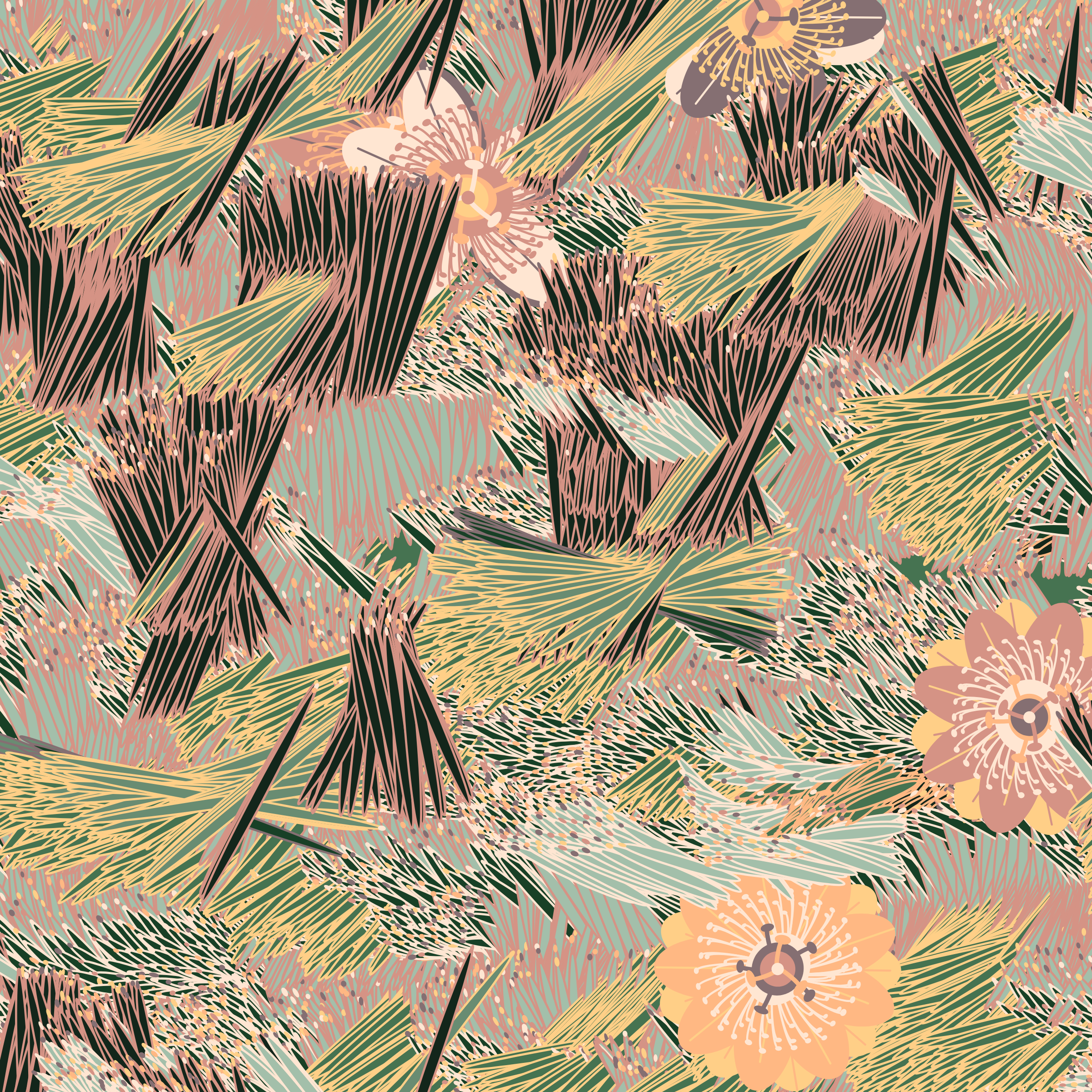 “Fragments of an infinite field” is a compositional system in which an idealized plant species is generated and arranged in a potentially infinite field of foliage. The main environmental parameter of the composition is the determination of a season of the year. The season determines the landscape’s colors and defines specific phenomena for each of them, such as rain in summer, snow in winter, petals falling in autumn, and pollen in spring. The flower has several possible variables, which can be macro aspects, affecting the entire population of the species, or micro, affecting each individual of the species differently. For example, the number of petals can be equal in all individuals or not. The number of filaments and other structures of the flower can undergo minor deviations, generating small mutations. The confusion between the figure (plant) and the background (earth, sky, other natural elements) is fascinating from a compositional point of view. The background colors are, most of the time, colors present in the figures, often breaking the boundary between them and, therefore, generating chromatic masses. In this project I also intend to research the following question: How to create parameters that resemble a living organism's growth? In this sense, the project approaches digital morphogenesis and the development of procedural organisms.