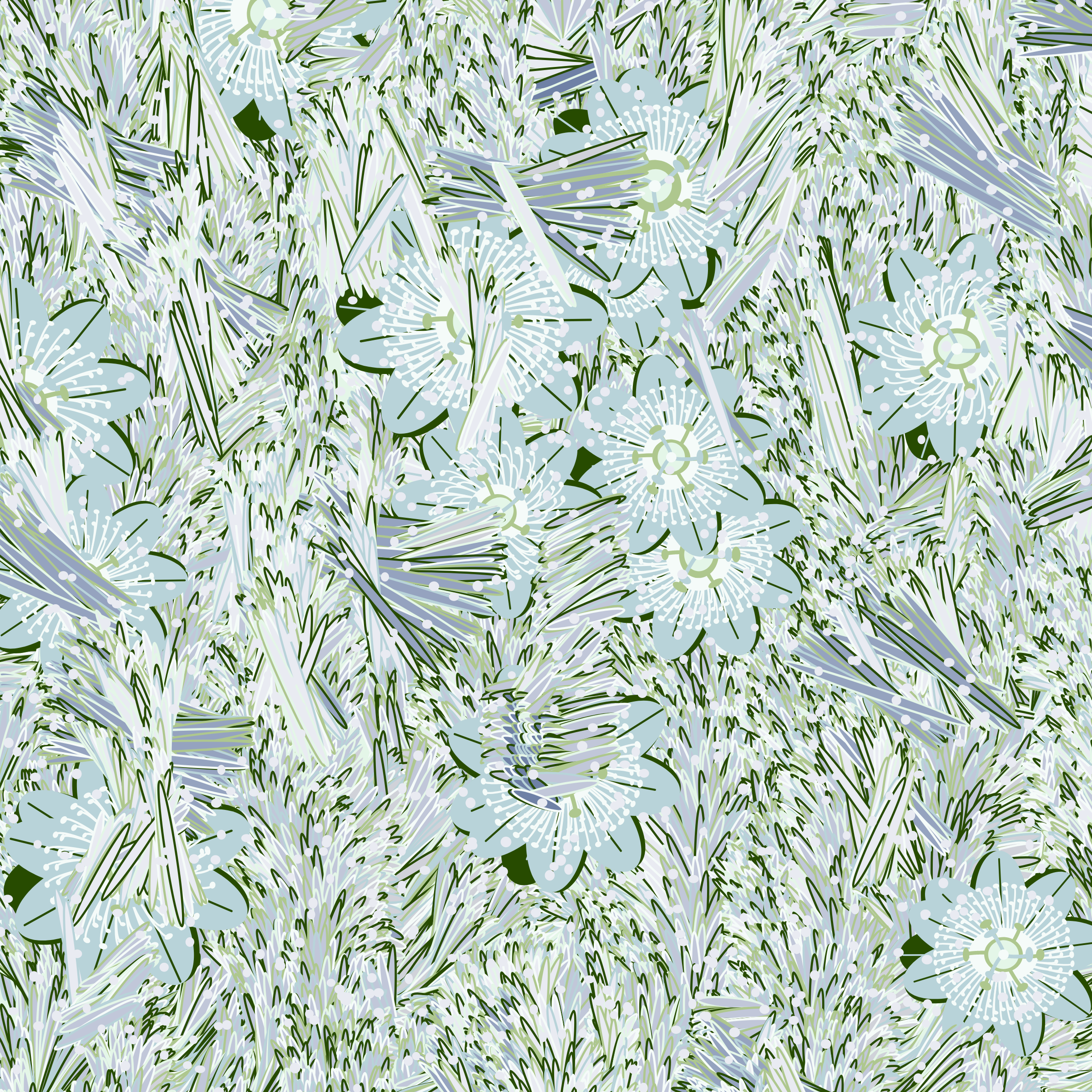 “Fragments of an infinite field” is a compositional system in which an idealized plant species is generated and arranged in a potentially infinite field of foliage. The main environmental parameter of the composition is the determination of a season of the year. The season determines the landscape’s colors and defines specific phenomena for each of them, such as rain in summer, snow in winter, petals falling in autumn, and pollen in spring. The flower has several possible variables, which can be macro aspects, affecting the entire population of the species, or micro, affecting each individual of the species differently. For example, the number of petals can be equal in all individuals or not. The number of filaments and other structures of the flower can undergo minor deviations, generating small mutations. The confusion between the figure (plant) and the background (earth, sky, other natural elements) is fascinating from a compositional point of view. The background colors are, most of the time, colors present in the figures, often breaking the boundary between them and, therefore, generating chromatic masses. In this project I also intend to research the following question: How to create parameters that resemble a living organism's growth? In this sense, the project approaches digital morphogenesis and the development of procedural organisms.