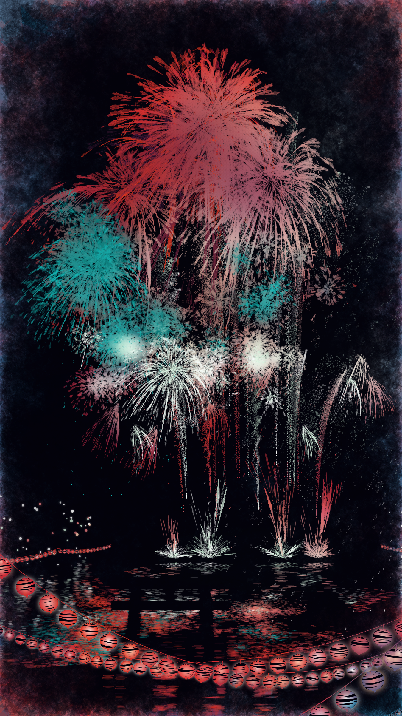 With fireworks as the central theme, it consists of the water surface reflecting the fireworks, the city lights in the distance, the silhouettes of the torii gates and arch bridge, and the twinkling lanterns. The shady black background expresses the smoky atmosphere.