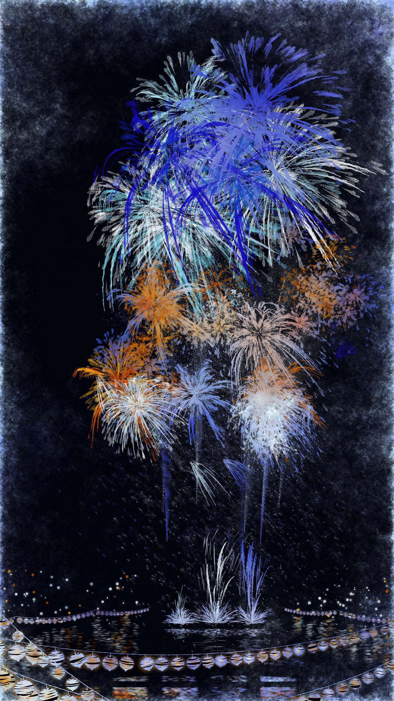With fireworks as the central theme, it consists of the water surface reflecting the fireworks, the city lights in the distance, the silhouettes of the torii gates and arch bridge, and the twinkling lanterns. The shady black background expresses the smoky atmosphere.