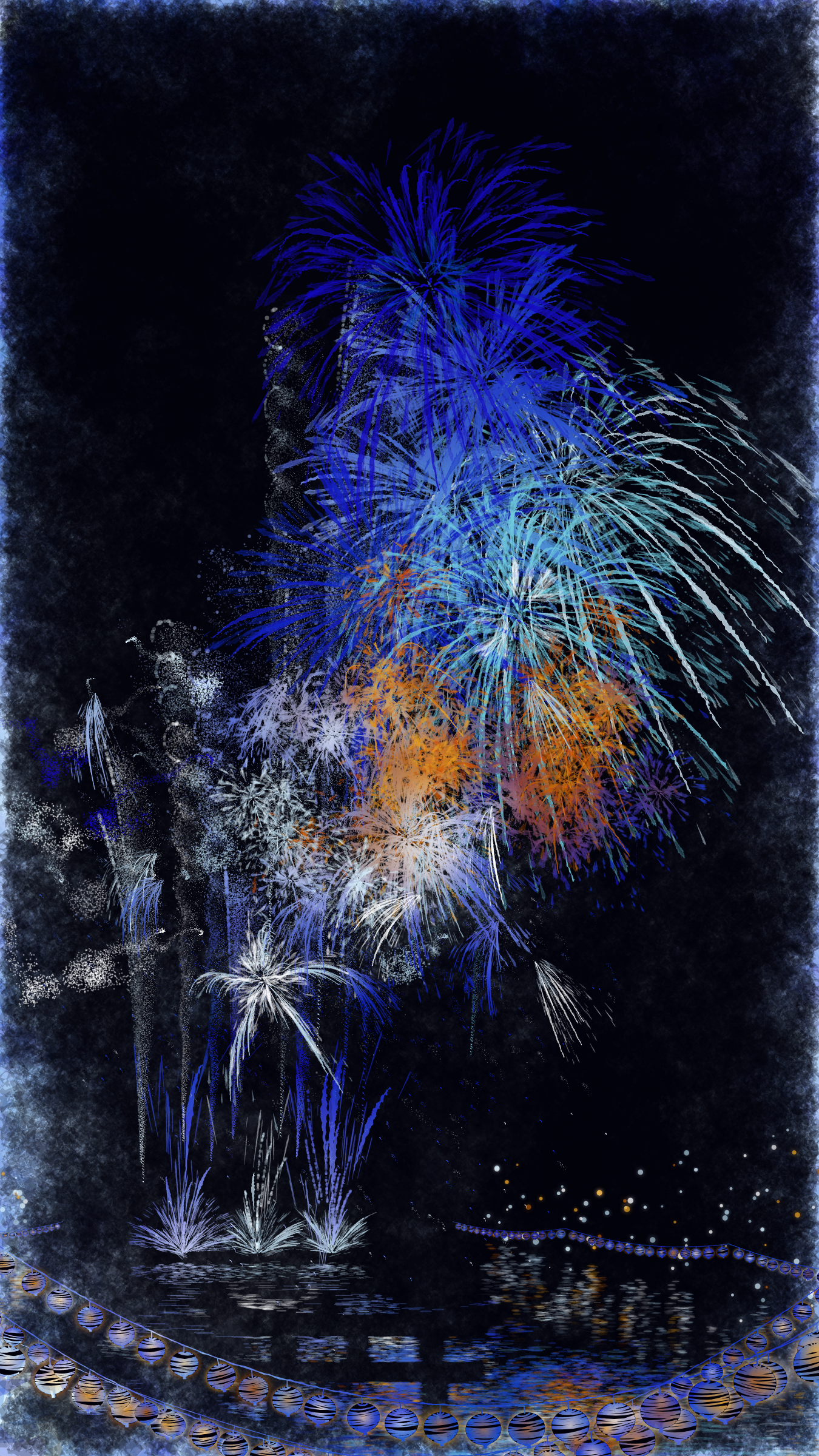 The drawing algorithm of the work is inspired by traditional woodblock prints and contemporary scratch art. Base layer is drawn with pale watercolor-like gradation. On top of that, the shady black background is drawn. Then, the outline of the fireworks is carved out.