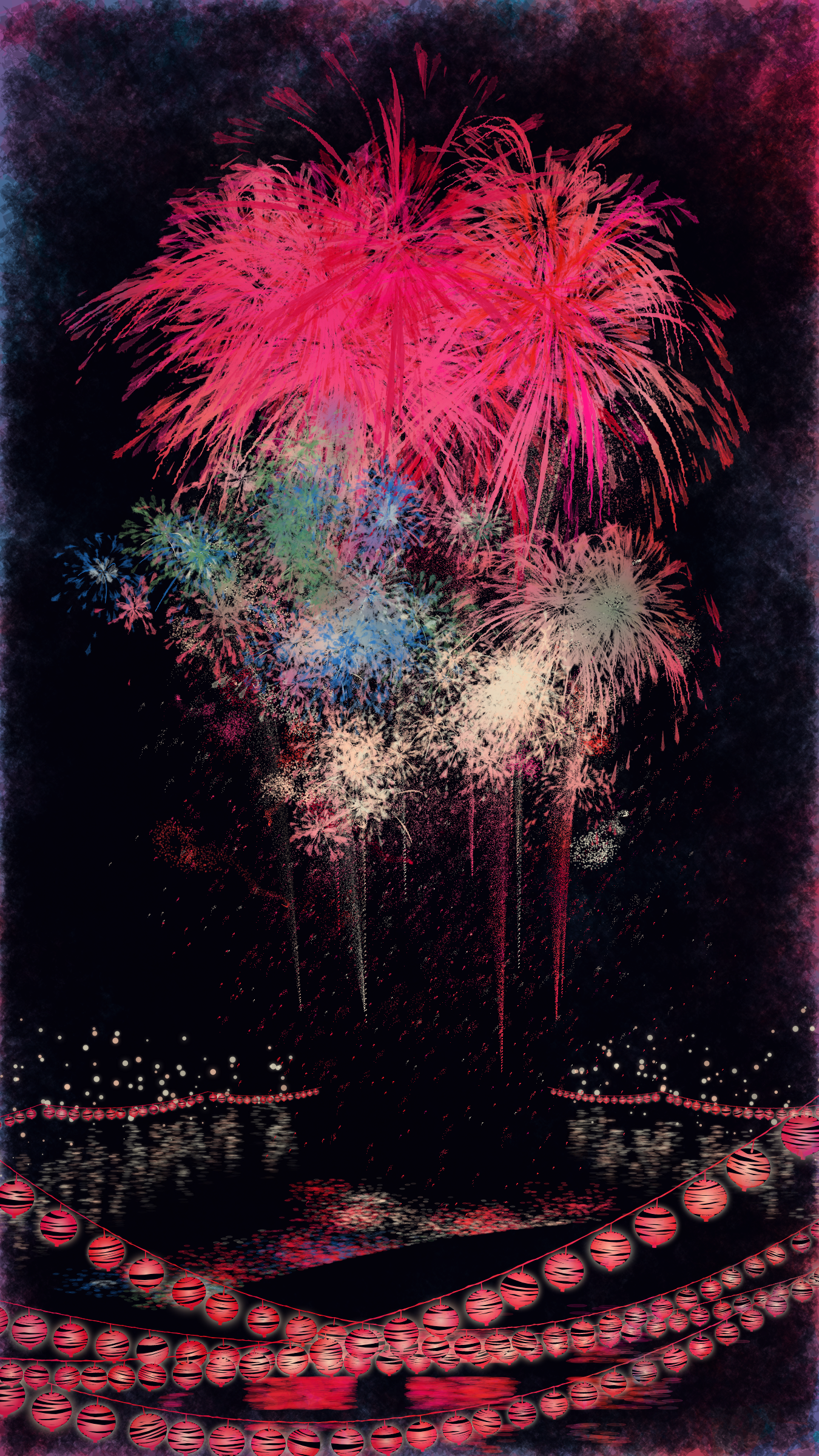 With fireworks as the central theme, it consists of the water surface reflecting the fireworks, the city lights in the distance, the silhouettes of the torii gates and arch bridge, and the twinkling lanterns. The shady black background expresses the smoky atmosphere.