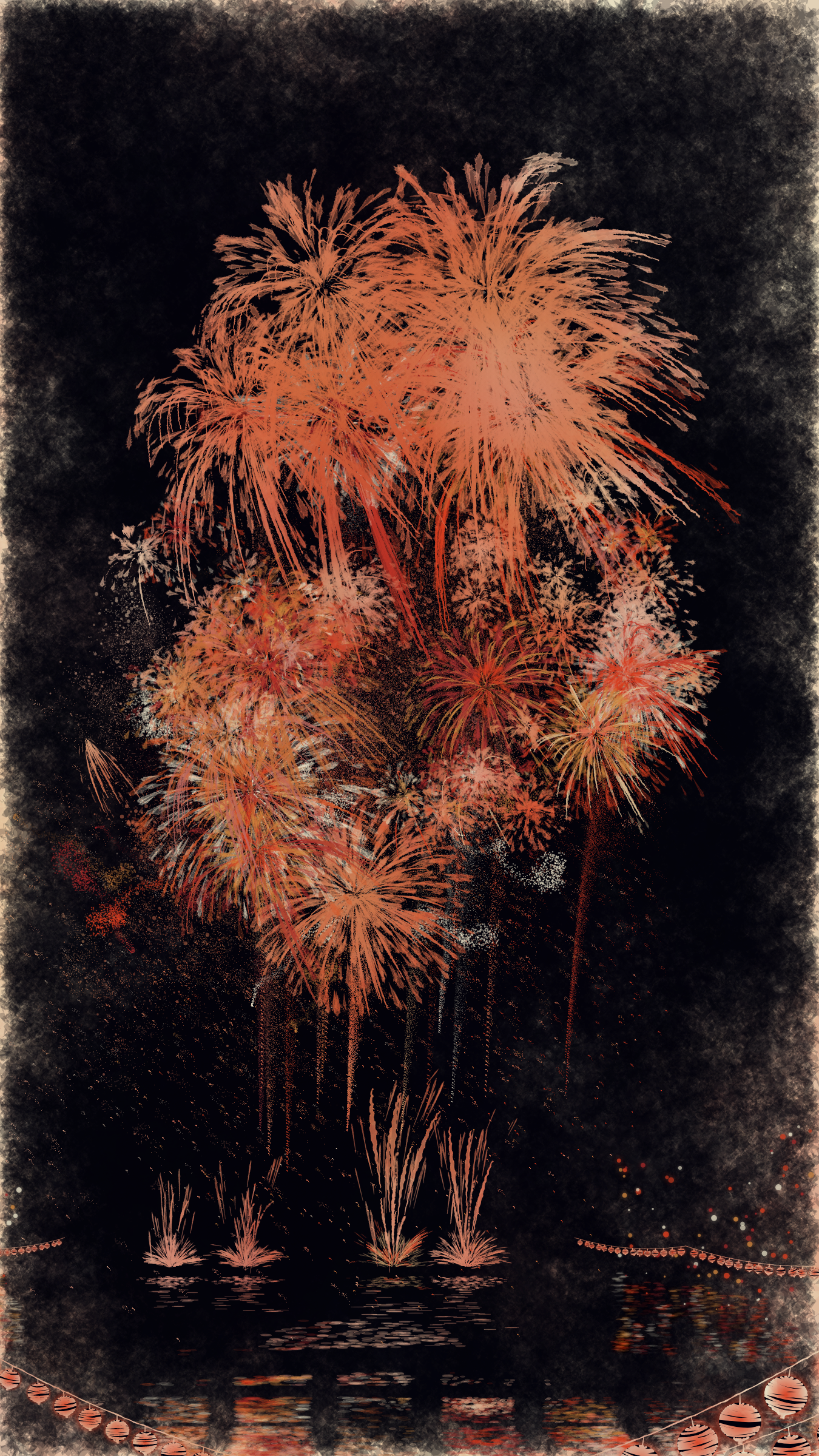 With fireworks as the central theme, it consists of the water surface reflecting the fireworks, the city lights in the distance, the silhouettes of the torii gates and arch bridge, and the twinkling lanterns. The shady black background expresses the smoky atmosphere.