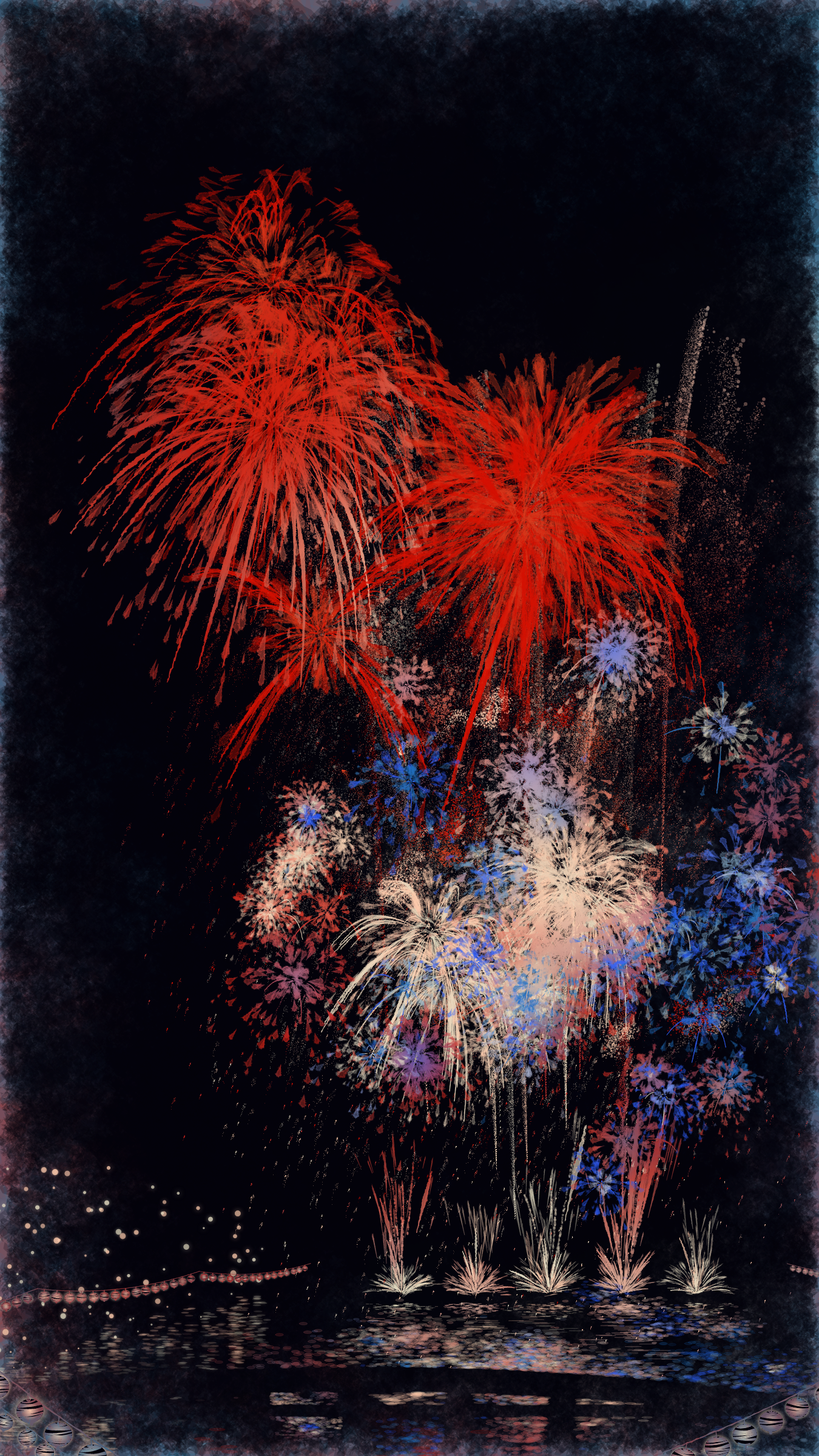 With fireworks as the central theme, it consists of the water surface reflecting the fireworks, the city lights in the distance, the silhouettes of the torii gates and arch bridge, and the twinkling lanterns. The shady black background expresses the smoky atmosphere.