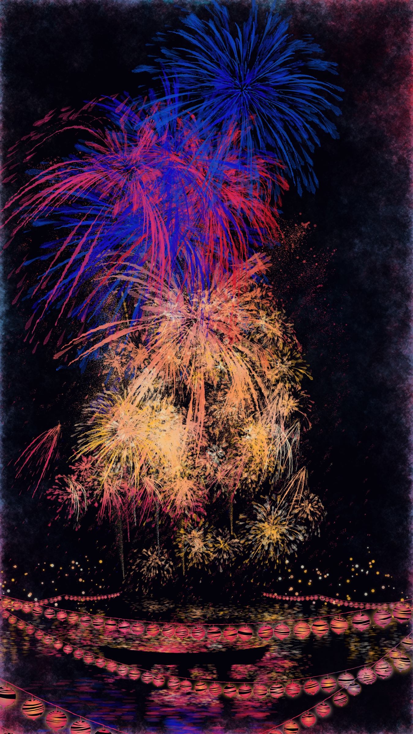 With fireworks as the central theme, it consists of the water surface reflecting the fireworks, the city lights in the distance, the silhouettes of the torii gates and arch bridge, and the twinkling lanterns. The shady black background expresses the smoky atmosphere.