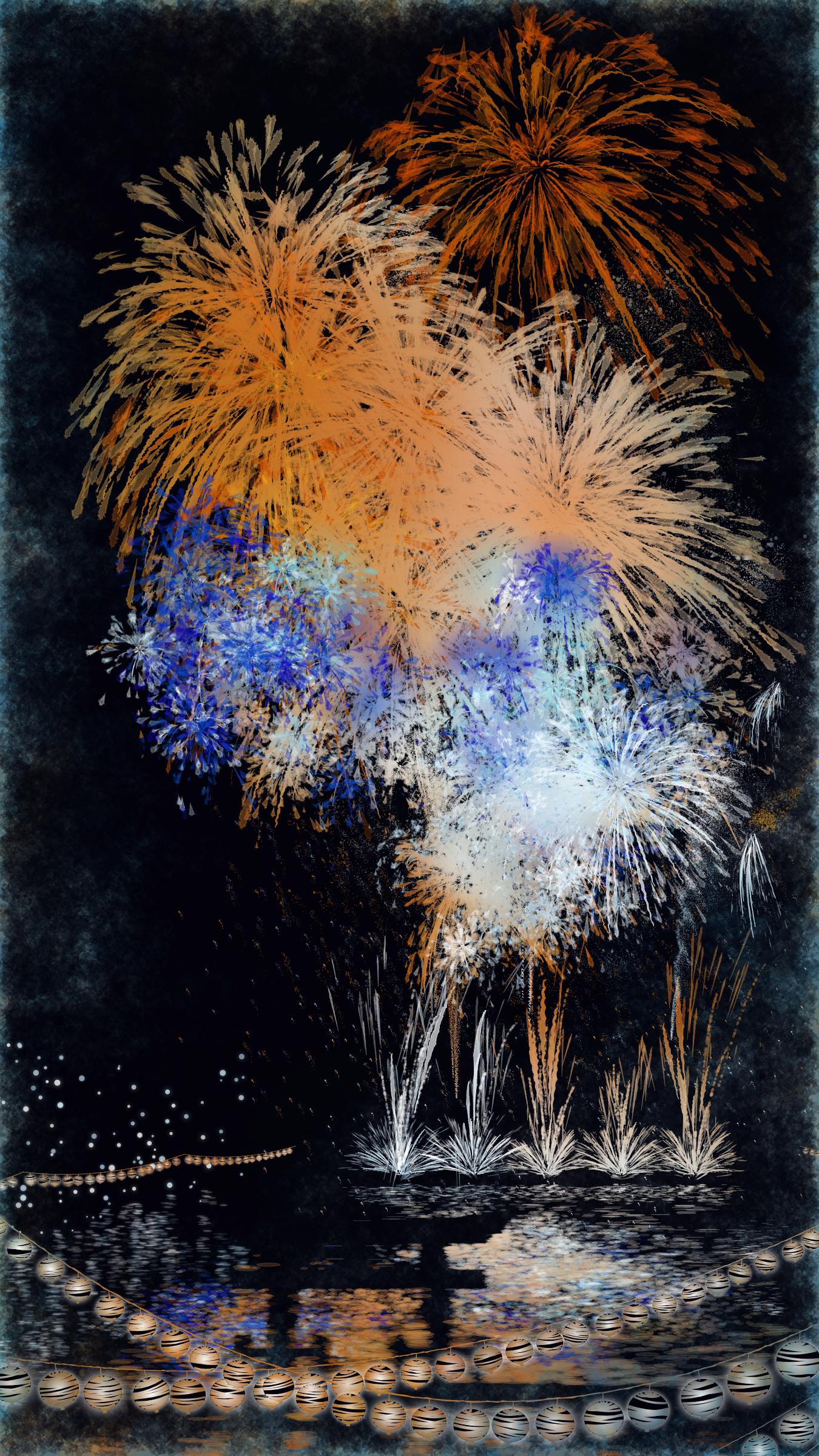 With fireworks as the central theme, it consists of the water surface reflecting the fireworks, the city lights in the distance, the silhouettes of the torii gates and arch bridge, and the twinkling lanterns. The shady black background expresses the smoky atmosphere.