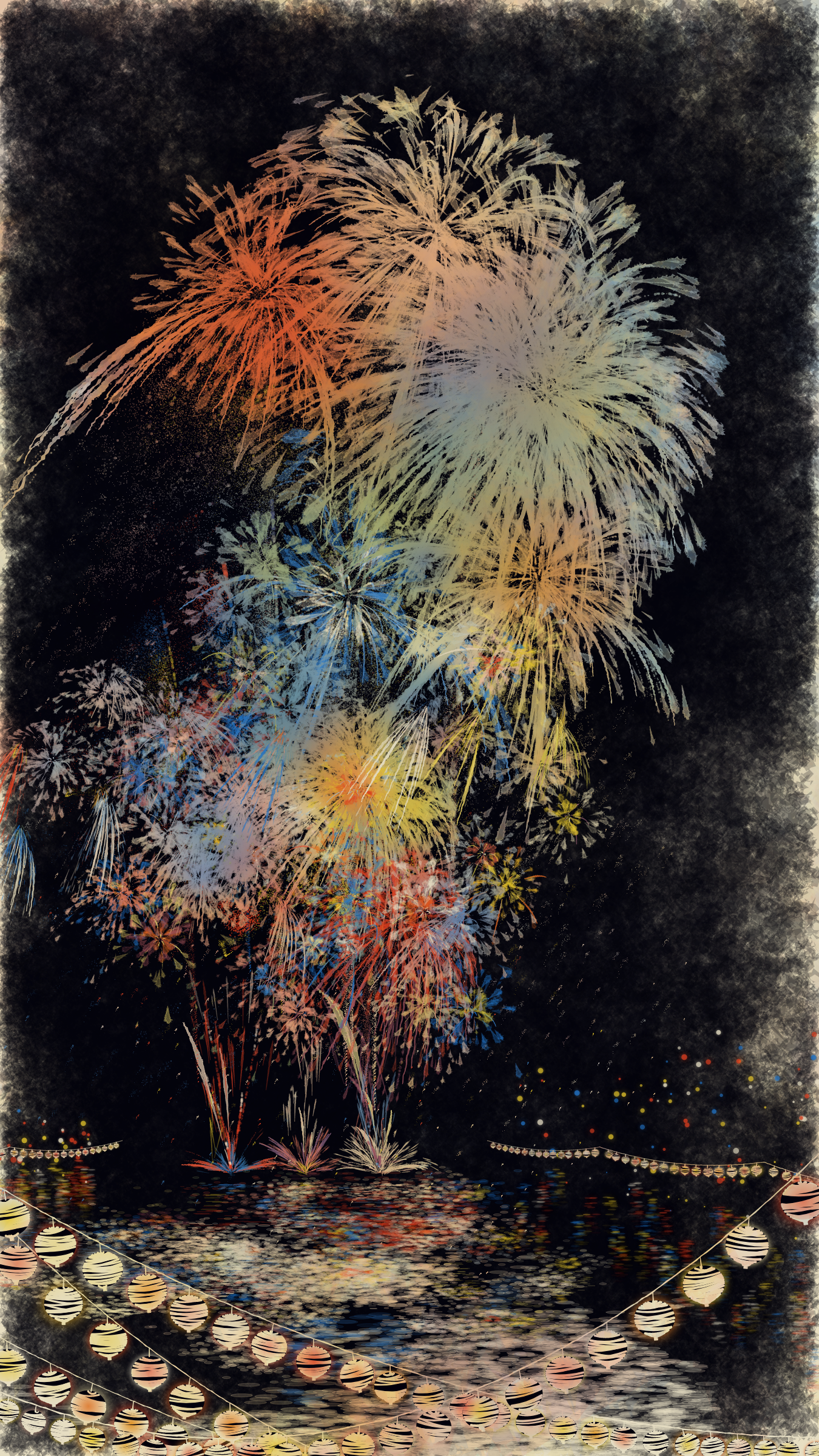 With fireworks as the central theme, it consists of the water surface reflecting the fireworks, the city lights in the distance, the silhouettes of the torii gates and arch bridge, and the twinkling lanterns. The shady black background expresses the smoky atmosphere.