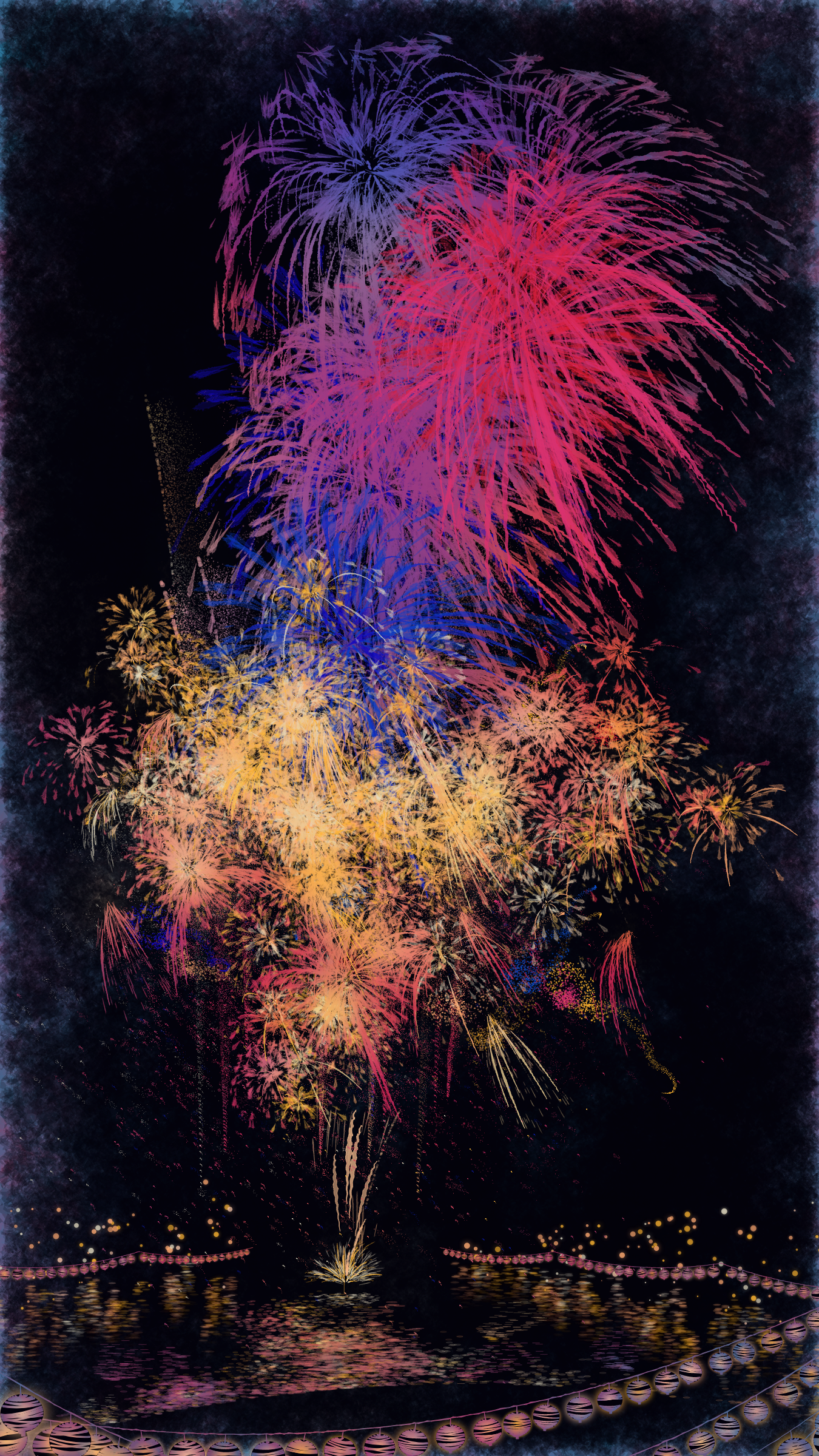 With fireworks as the central theme, it consists of the water surface reflecting the fireworks, the city lights in the distance, the silhouettes of the torii gates and arch bridge, and the twinkling lanterns. The shady black background expresses the smoky atmosphere.