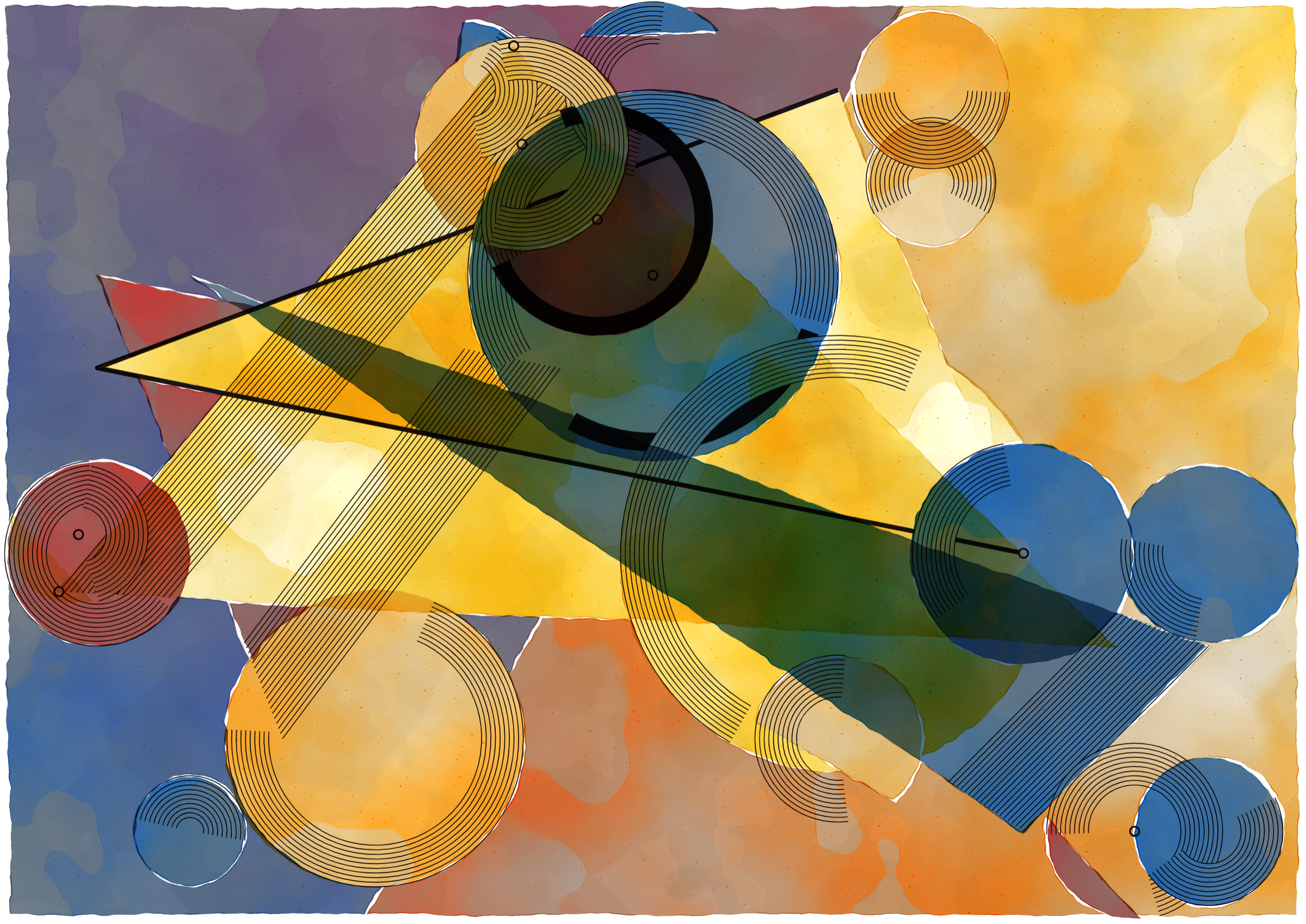 *Inprecision* is exploring the tension between the precision offered by computers and the imperfections inherent in classic art production approaches. The generative system is based on circles and triangles, perfectly aligned with each other and placed on a grid, but rendered with a technique inspired by the look of water color giving a high degree of imperfection in the rendered output. The precision of the underlying system is then again accentuated by a layer of hyper precise line drawings, outlining the used geometries and providing a scaffold for the underlying colors.