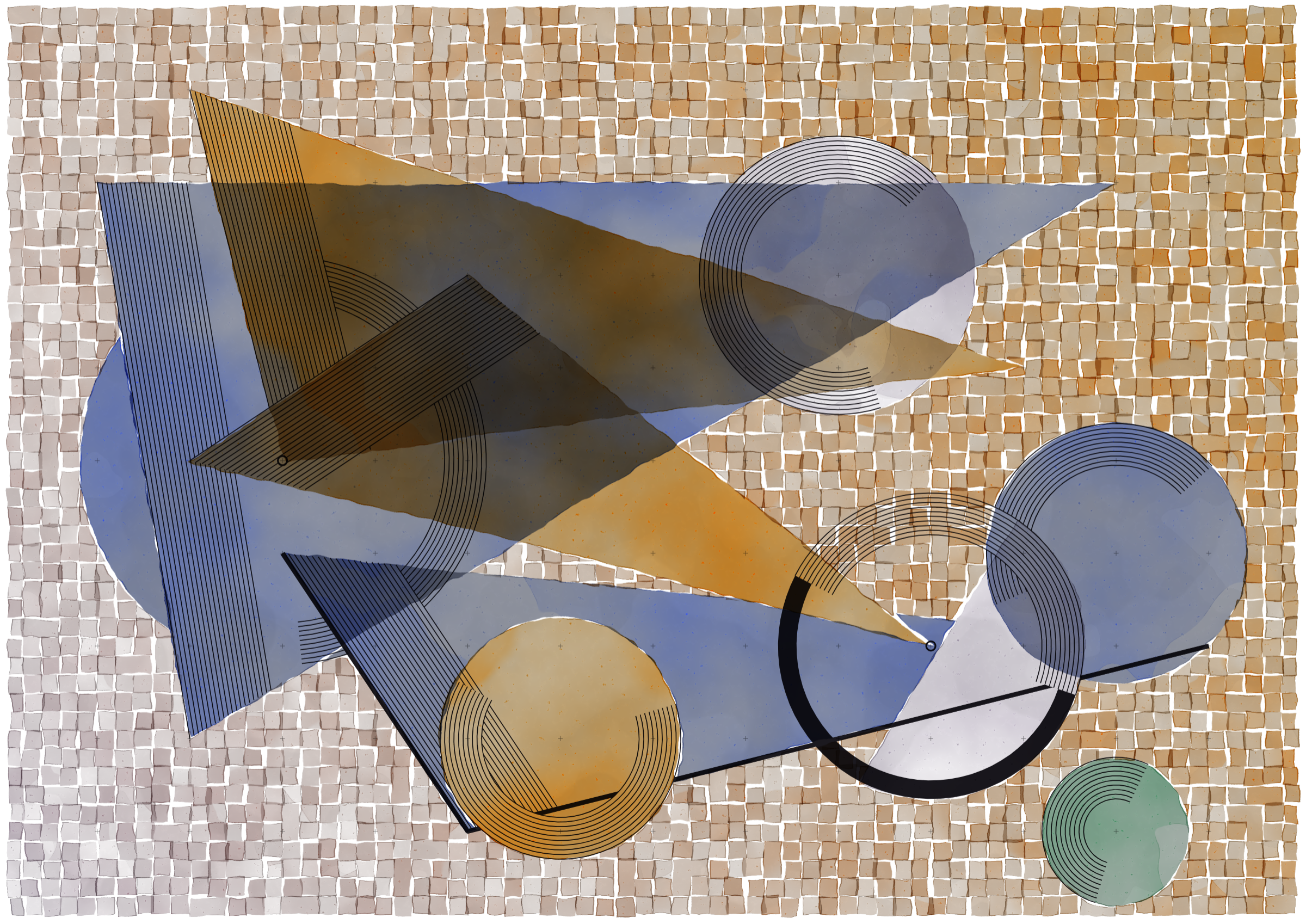 *Inprecision* is exploring the tension between the precision offered by computers and the imperfections inherent in classic art production approaches. The generative system is based on circles and triangles, perfectly aligned with each other and placed on a grid, but rendered with a technique inspired by the look of water color giving a high degree of imperfection in the rendered output. The precision of the underlying system is then again accentuated by a layer of hyper precise line drawings, outlining the used geometries and providing a scaffold for the underlying colors.